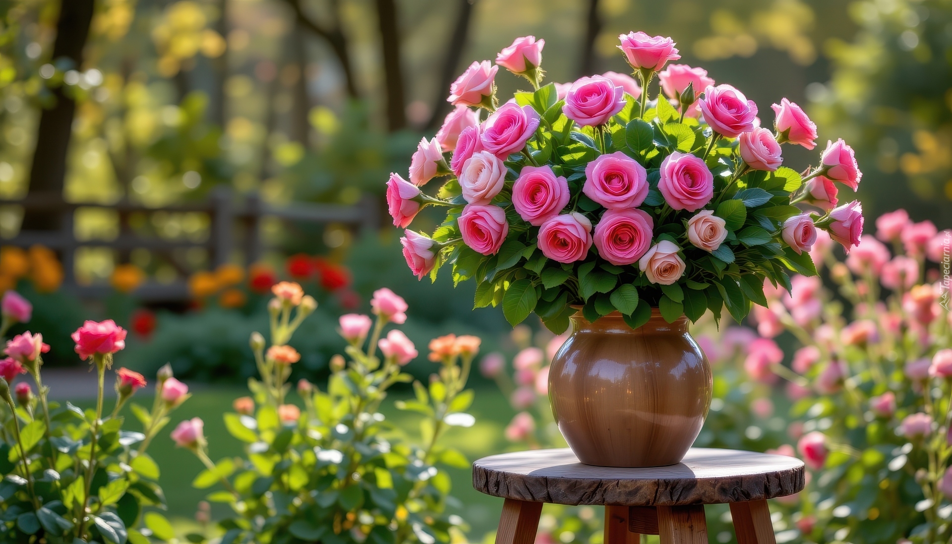 Edytor tapety: Różowe róże w wazonie na stołku w ogrodzie