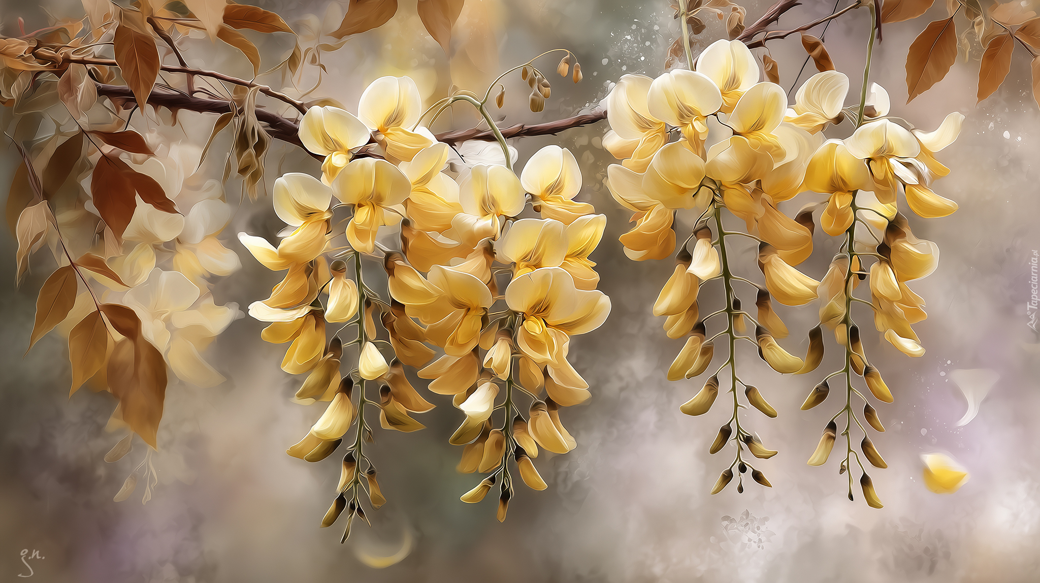 Edytor tapety: Żółte kwiaty złotokapu i liście na gałązce
