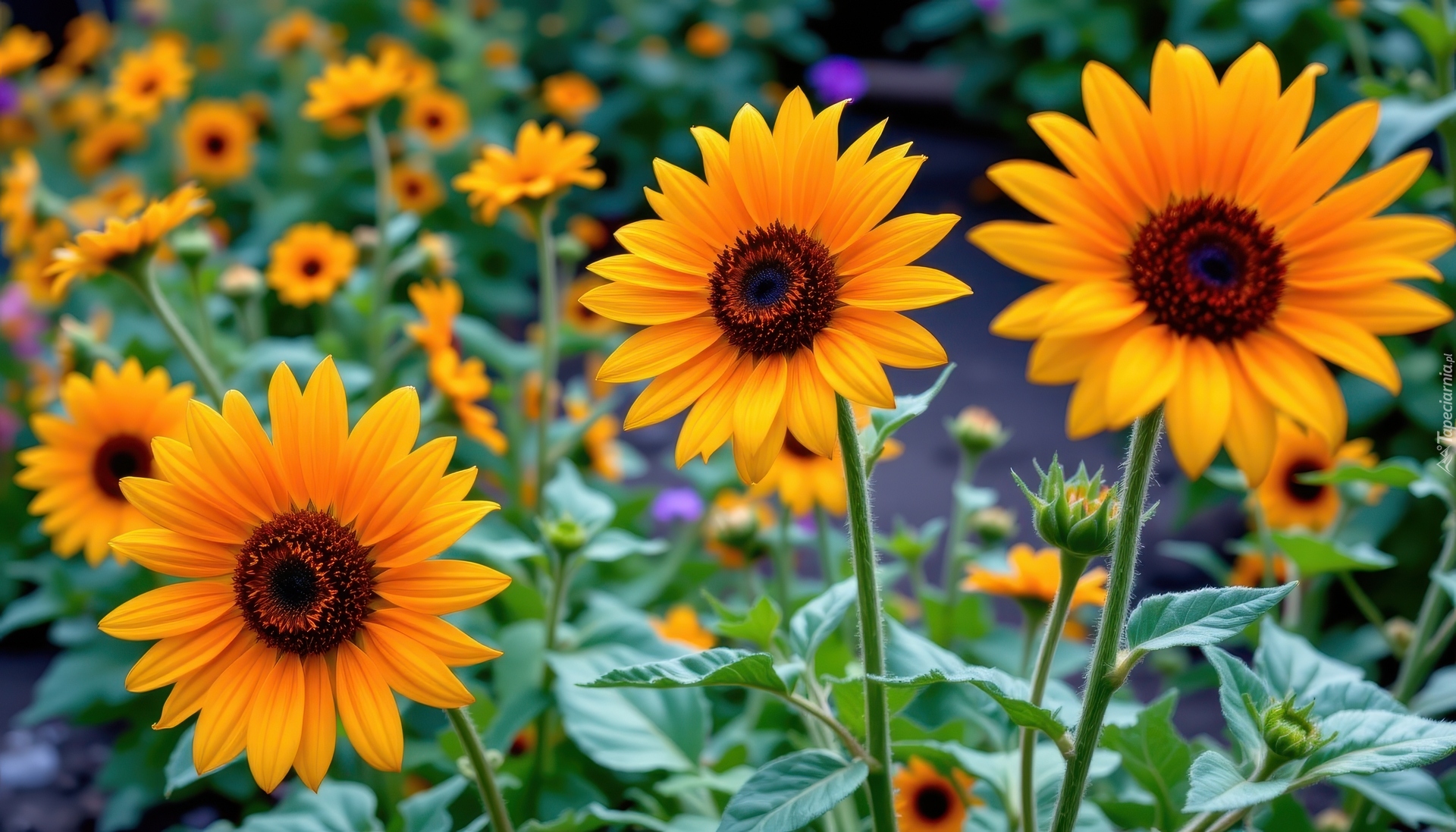 Edytor tapety: Słoneczniki ozdobne z liśćmi w zbliżeniu
