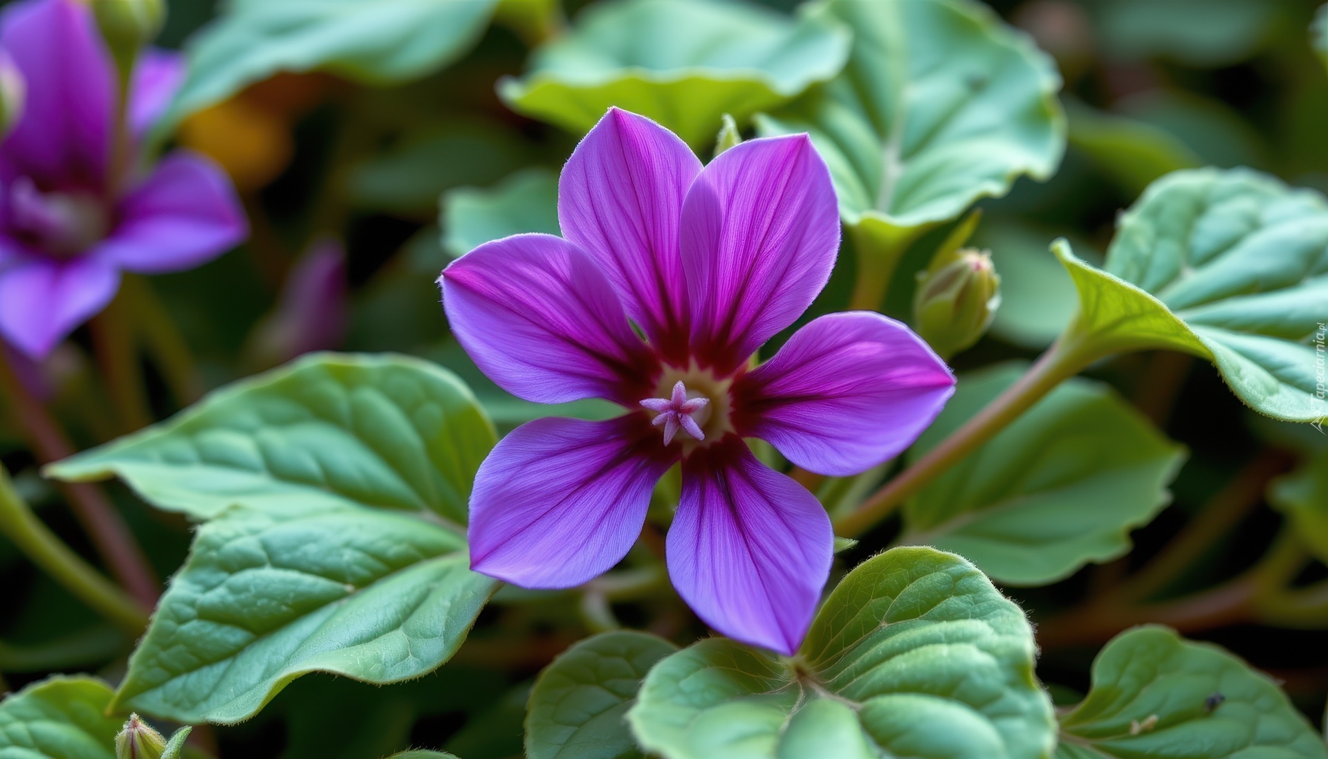 Edytor tapety: Rozkwitnięty fioletowy kwiat wśród liści