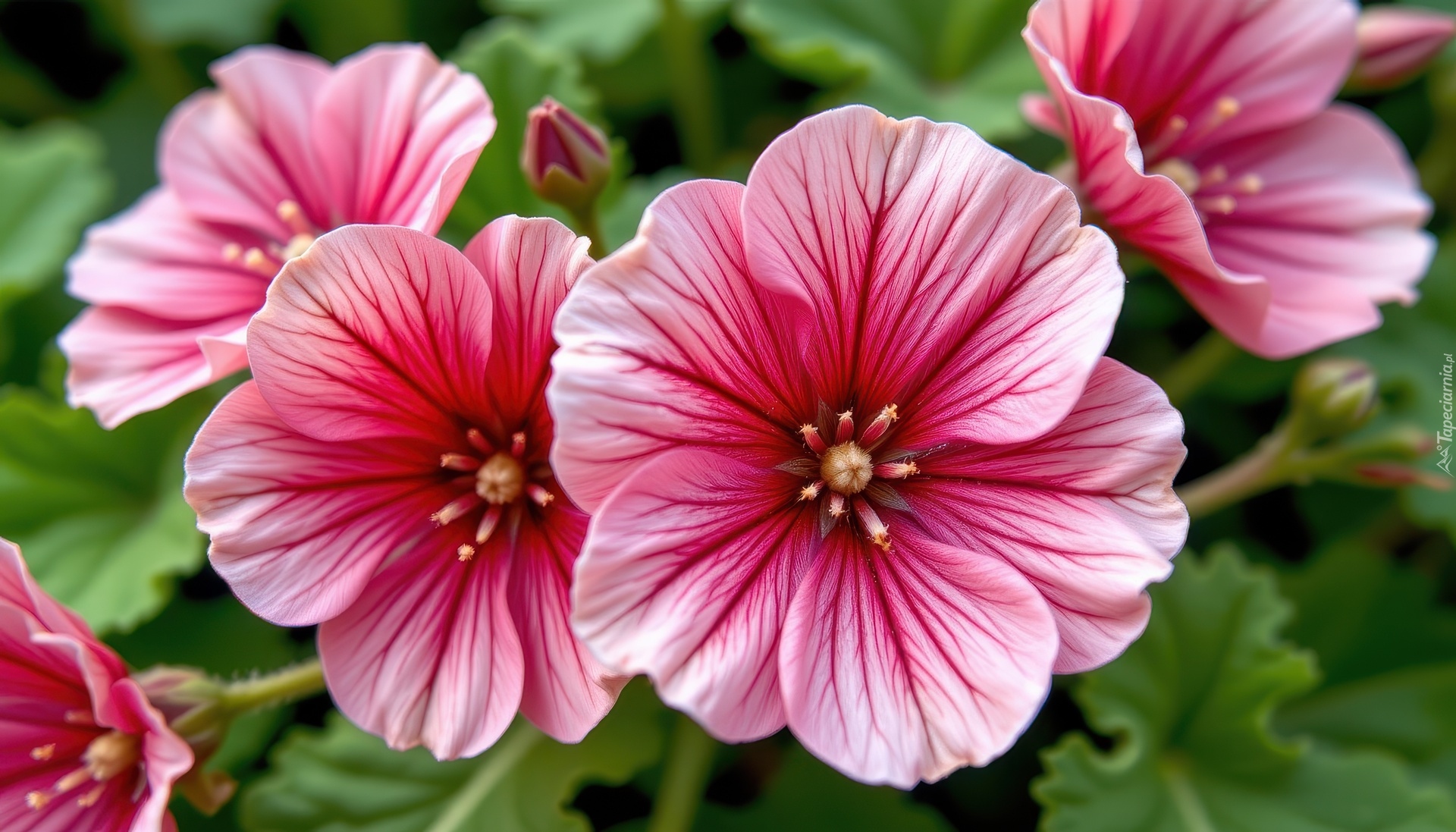 Edytor tapety: Różowe rozkwitnięte kwiaty z liśćmi w zbliżeniu