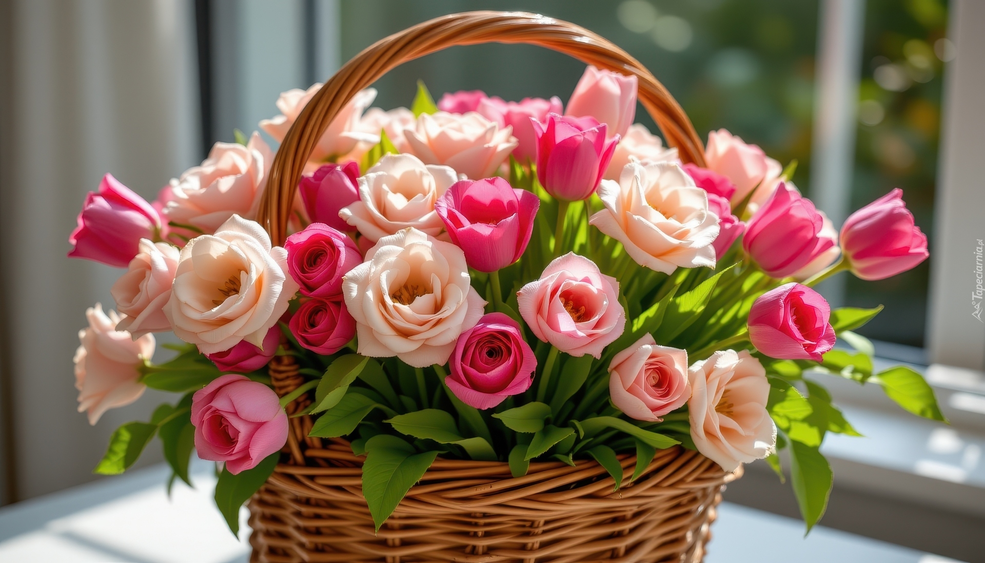 Edytor tapety: Różowe tulipany i róże w koszyku obok okna