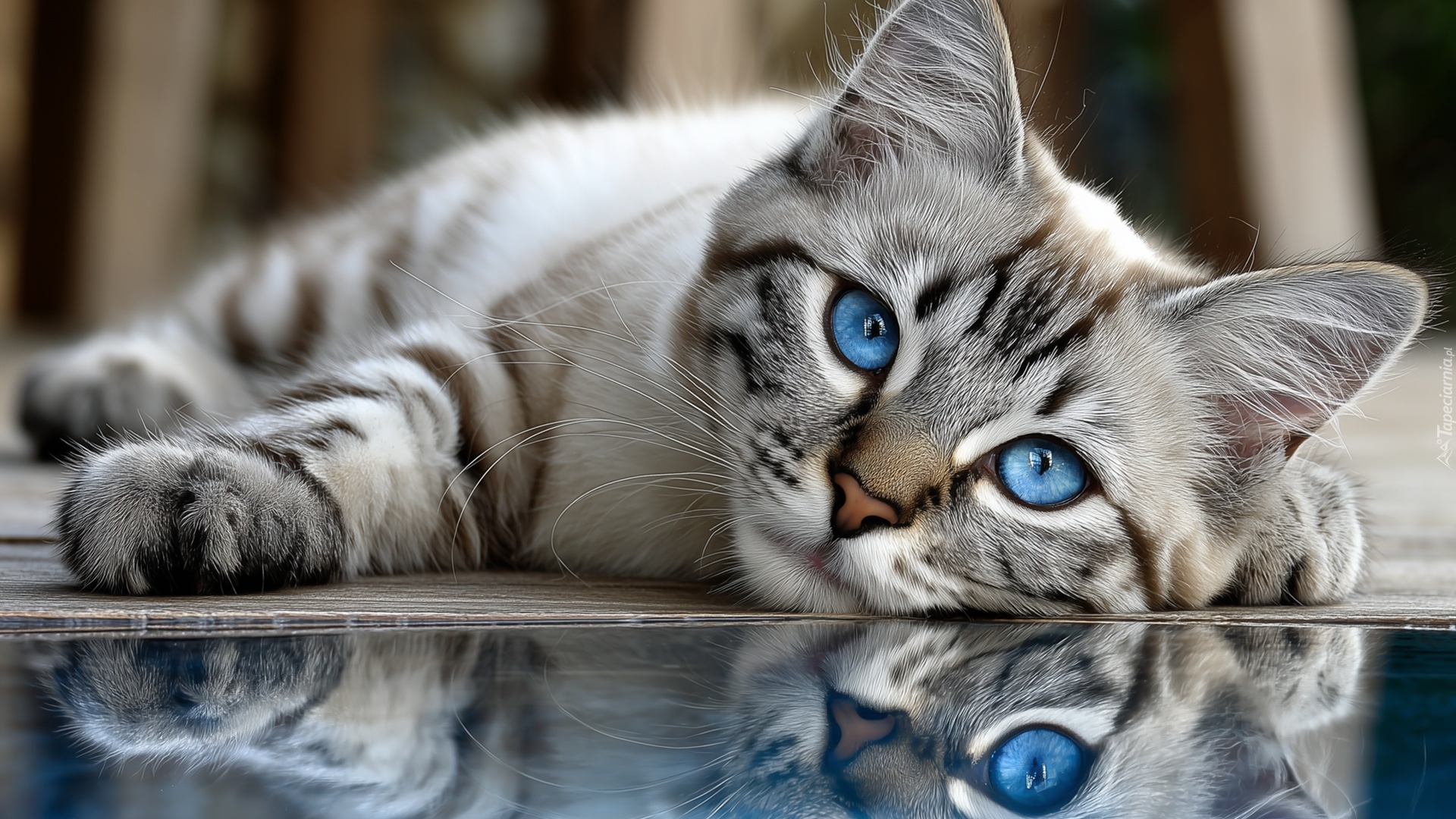 Edytor tapety: Leżący szary kot z niebieskimi oczami