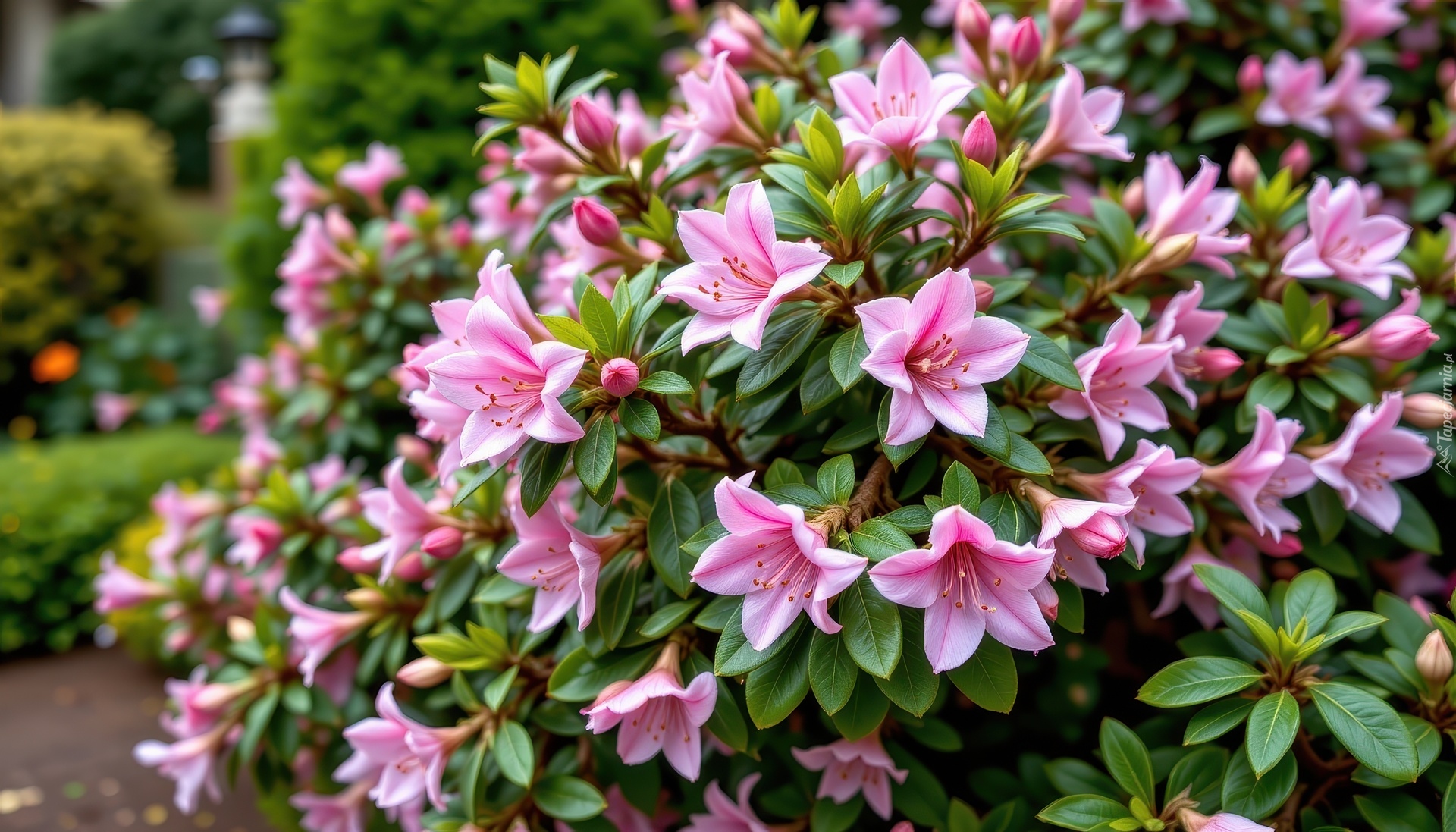Edytor tapety: Różowe kwiaty na krzewie różanecznika