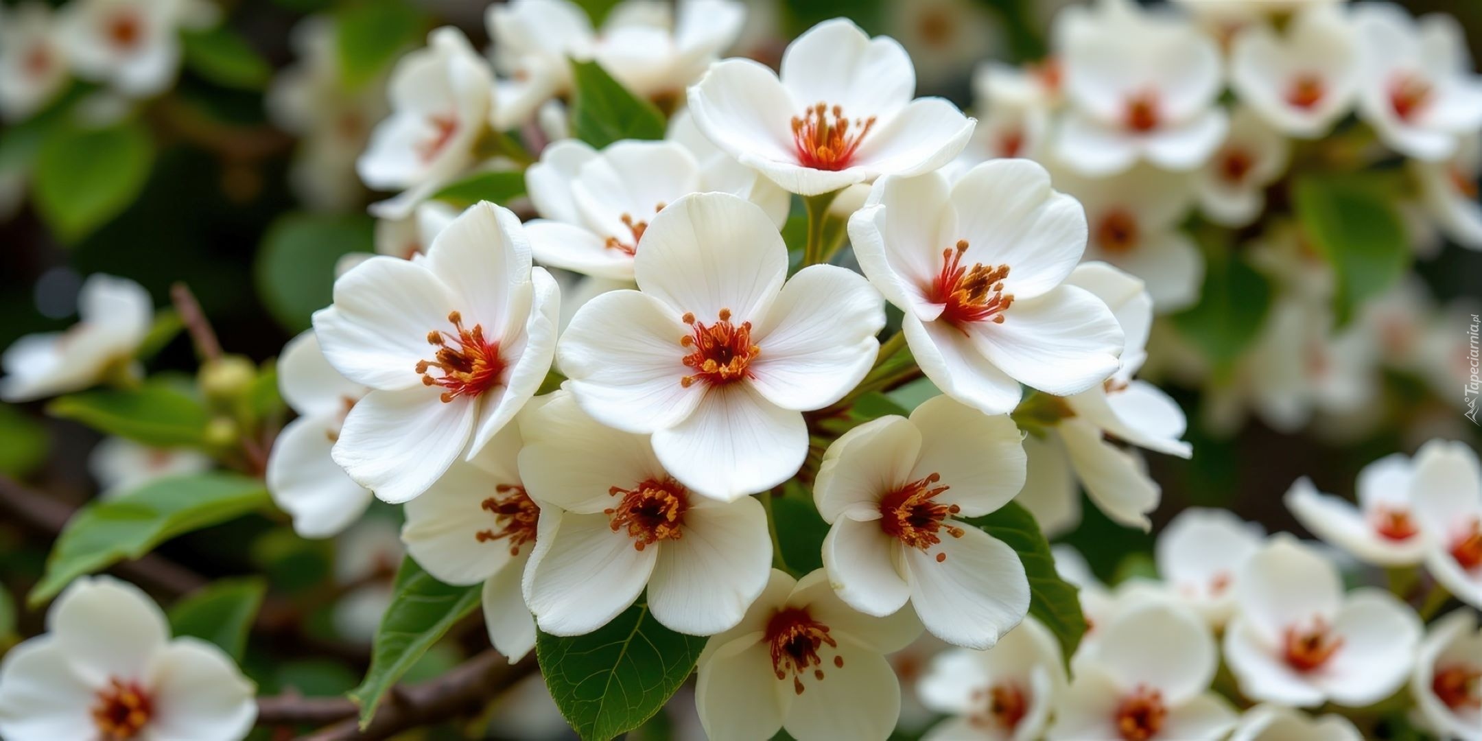 Edytor tapety: Białe kwiaty z czerwonymi pręcikami na gałązkach