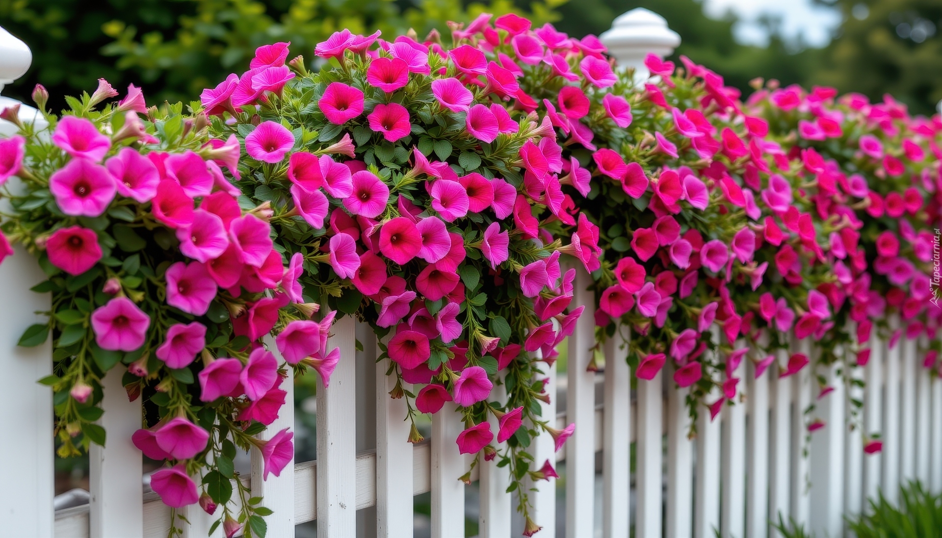 Edytor tapety: Różowe petunie zwisające z białego płotu