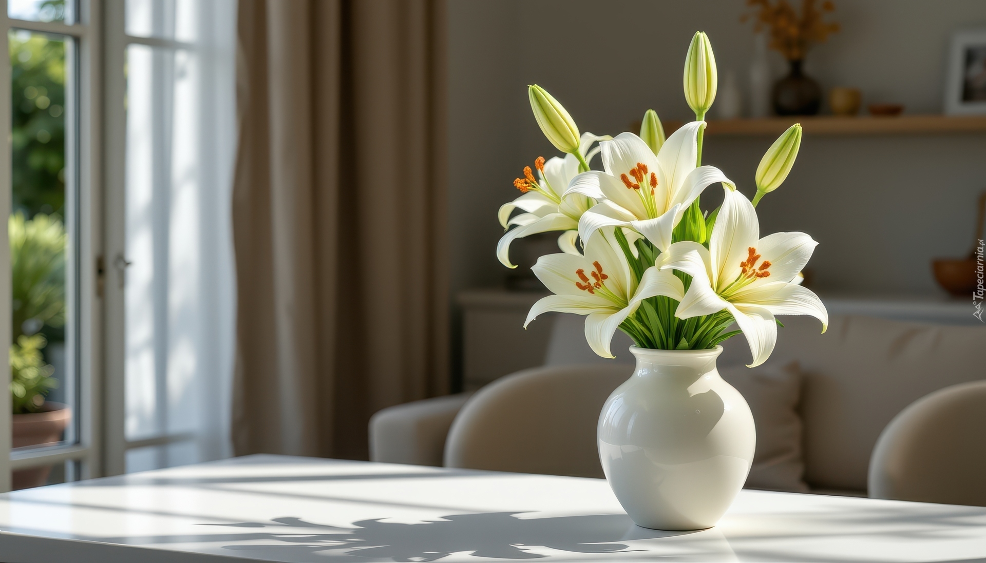Edytor tapety: Białe lilie w białym wazonie na stole