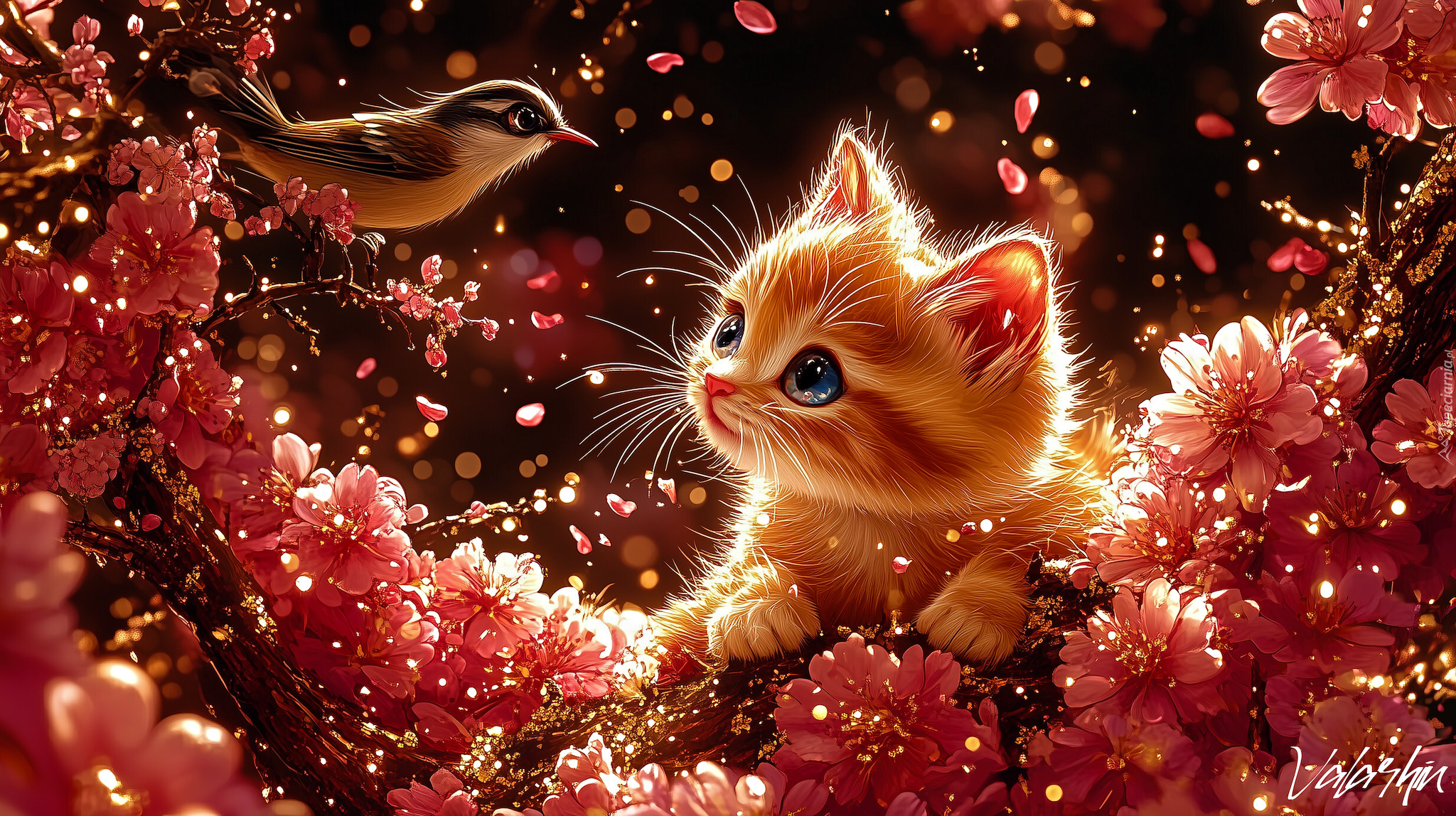 Edytor tapety: Mały kot i ptak wśród kwiatów