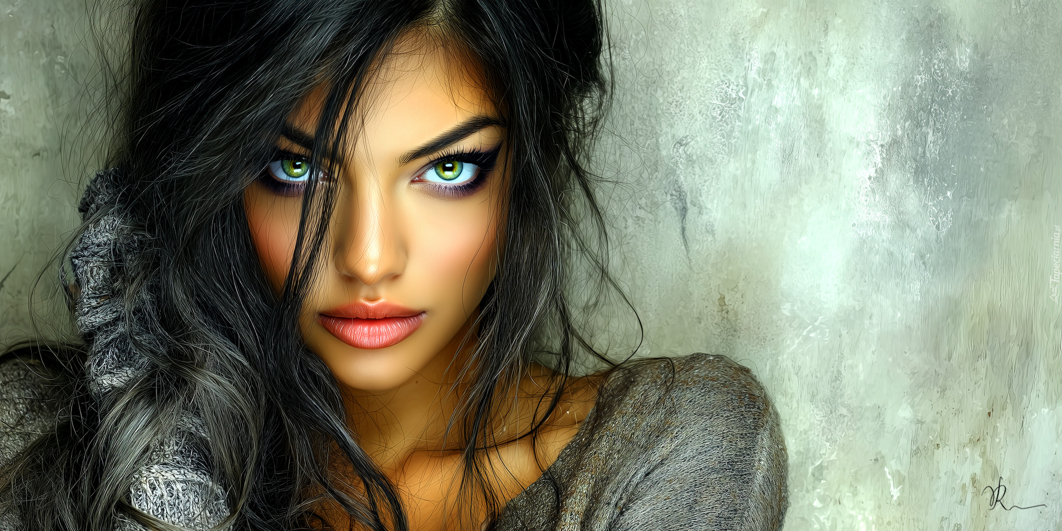 Edytor tapety: Spojrzenie ciemnowłosej kobiety z zielonymi oczami