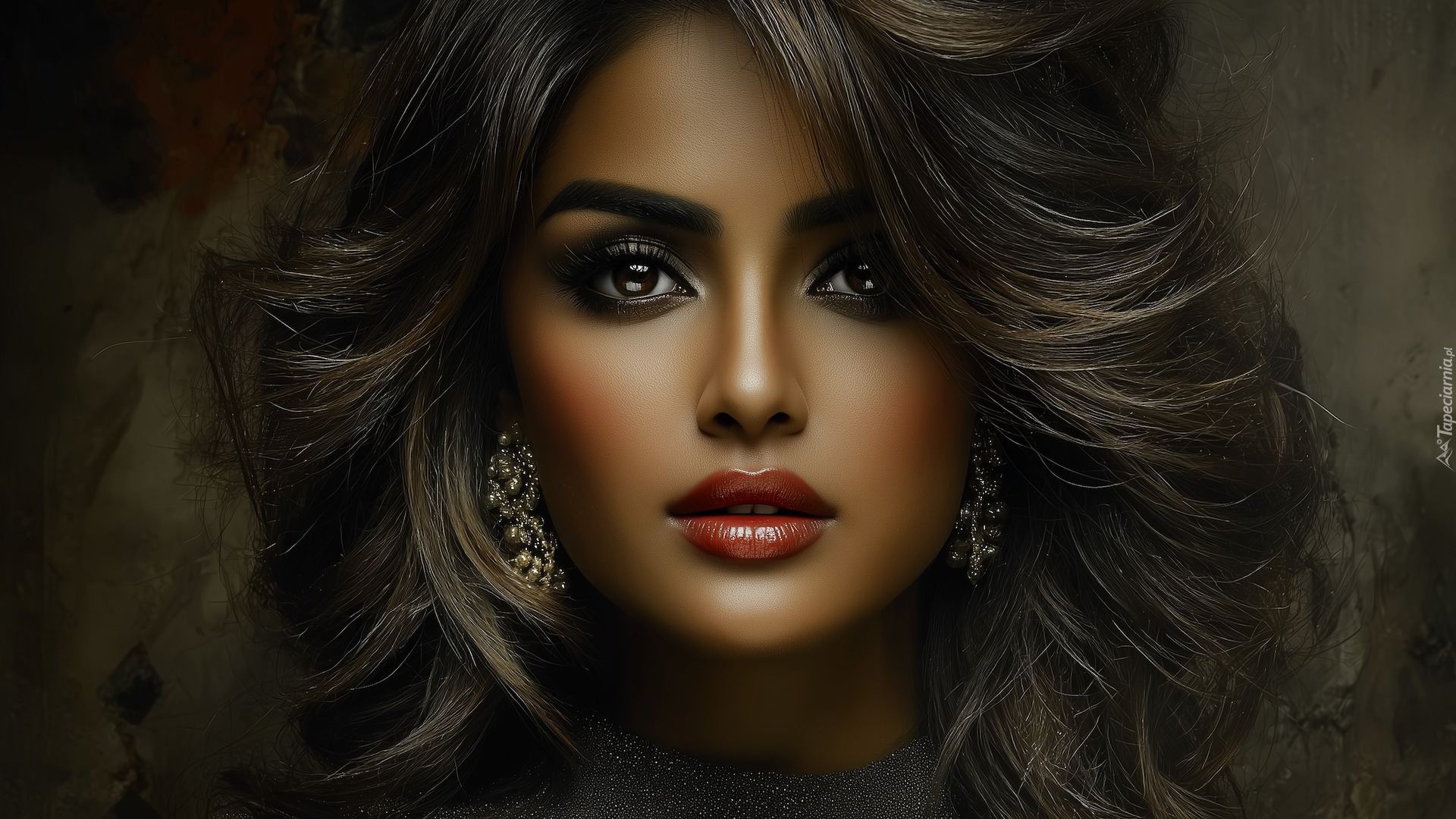 Edytor tapety: Twarz długowłosej szatynki w makijażu z kolczykami