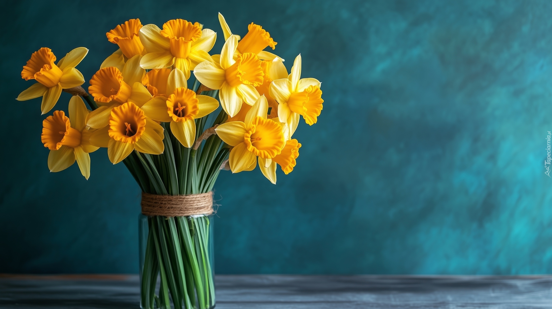 Edytor tapety: Bukiet z żółtych narcyzy żonkili w szklanym wazonie
