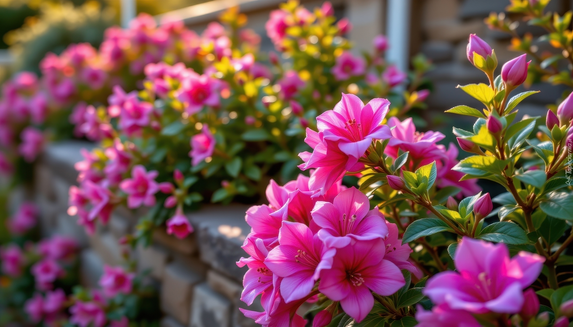 Edytor tapety: Gałązki z różowymi kwiatami różanecznika na murze