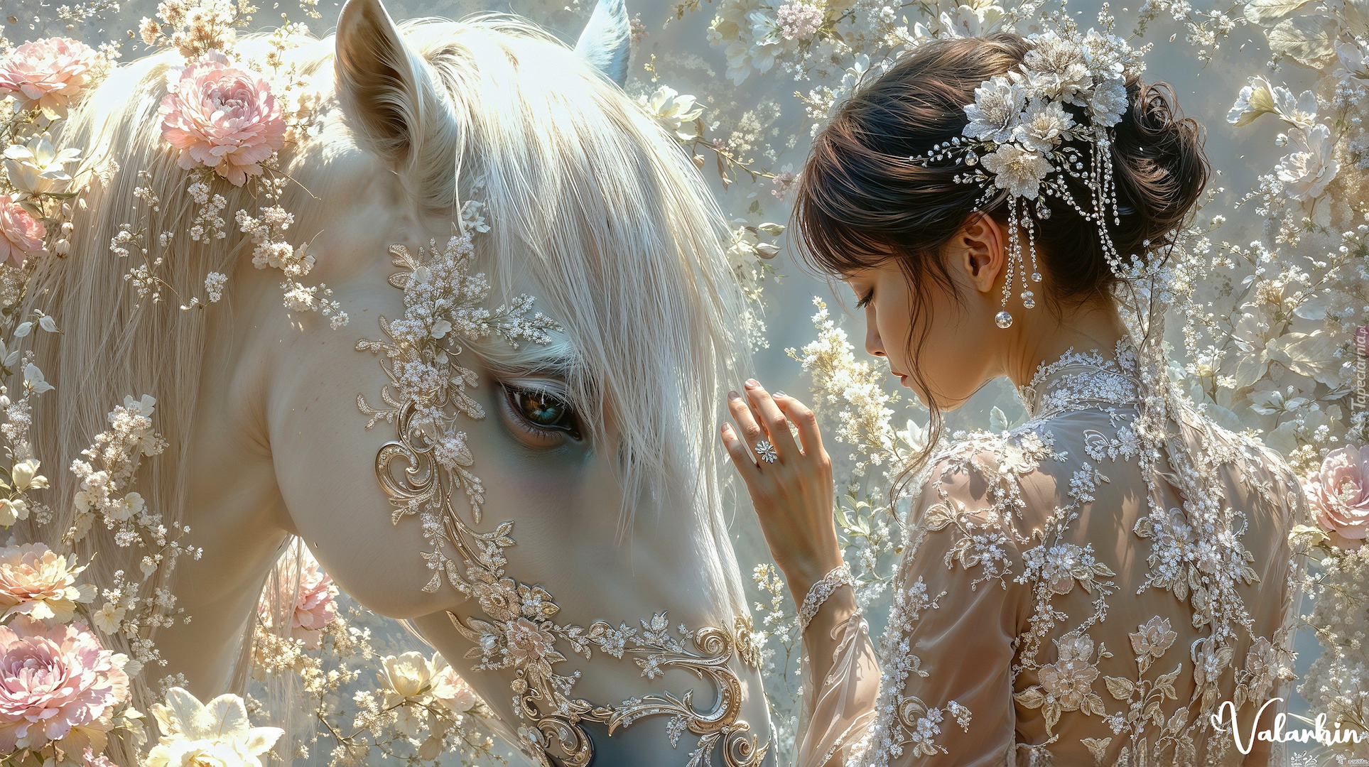 Edytor tapety: Kobieta w sukni ślubnej z białym koniem