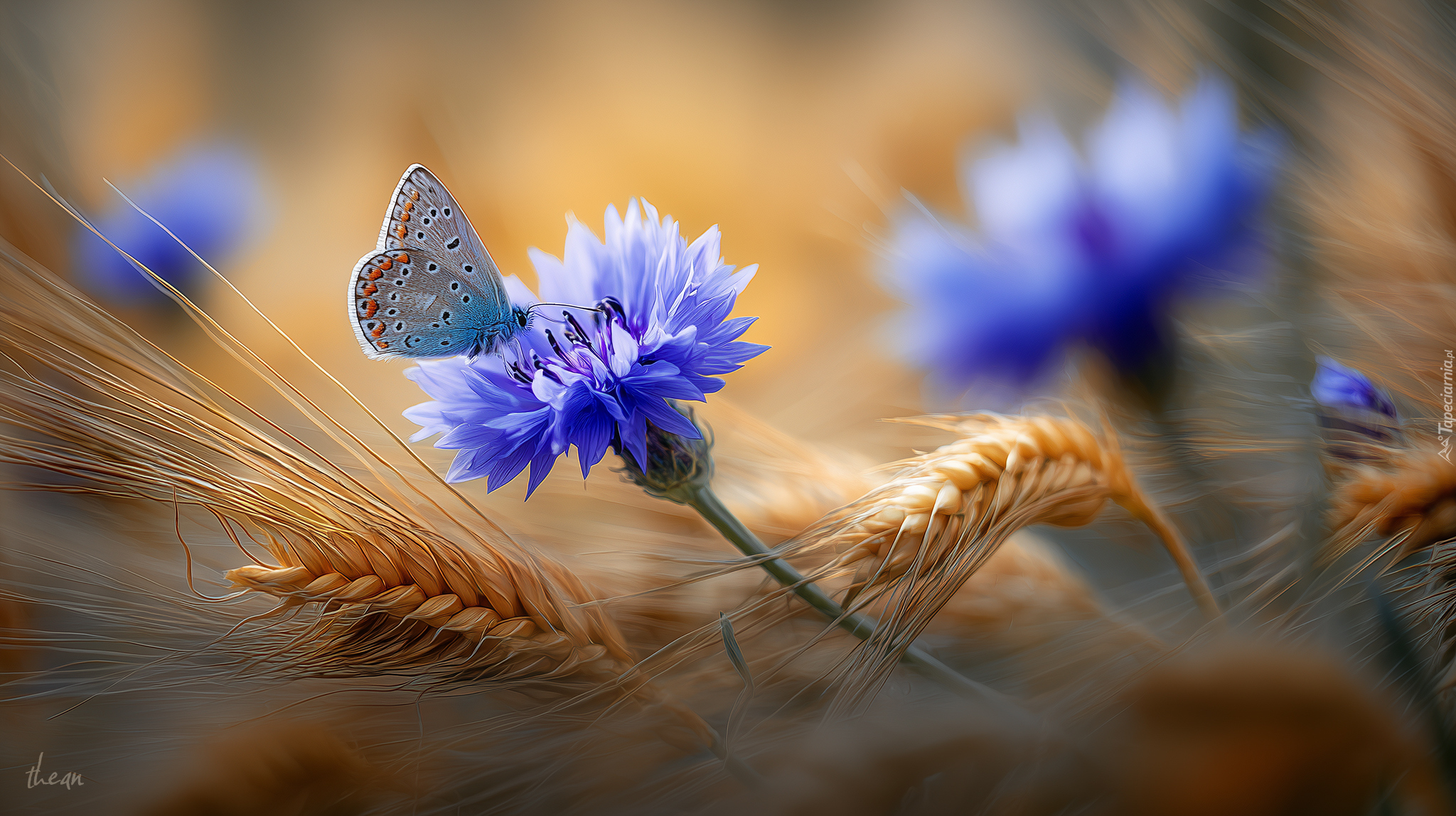 Edytor tapety: Modraszek na niebieskim chabrze wśród kłosów zboża