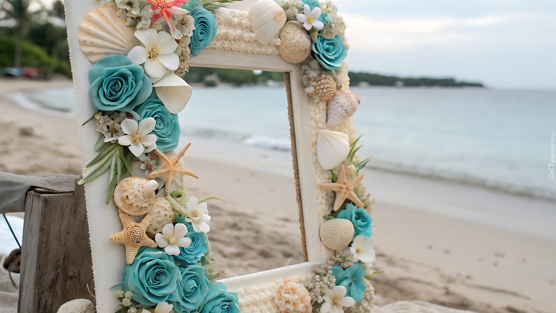 Edytor tapety: Ramka udekorowana muszelkami i różami na morskiej plaży