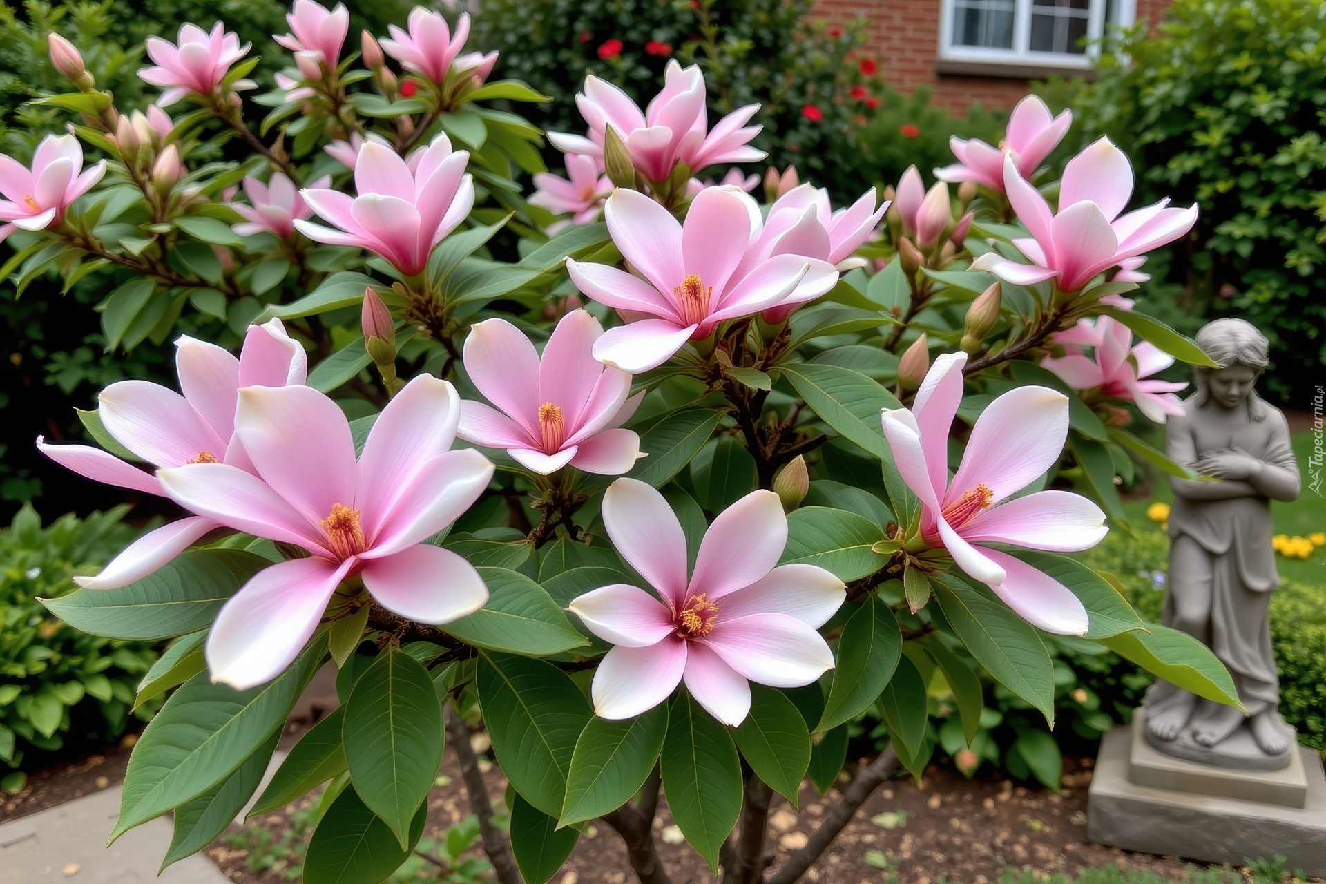 Edytor tapety: Różowe kwiaty magnolii i pąki na krzewie