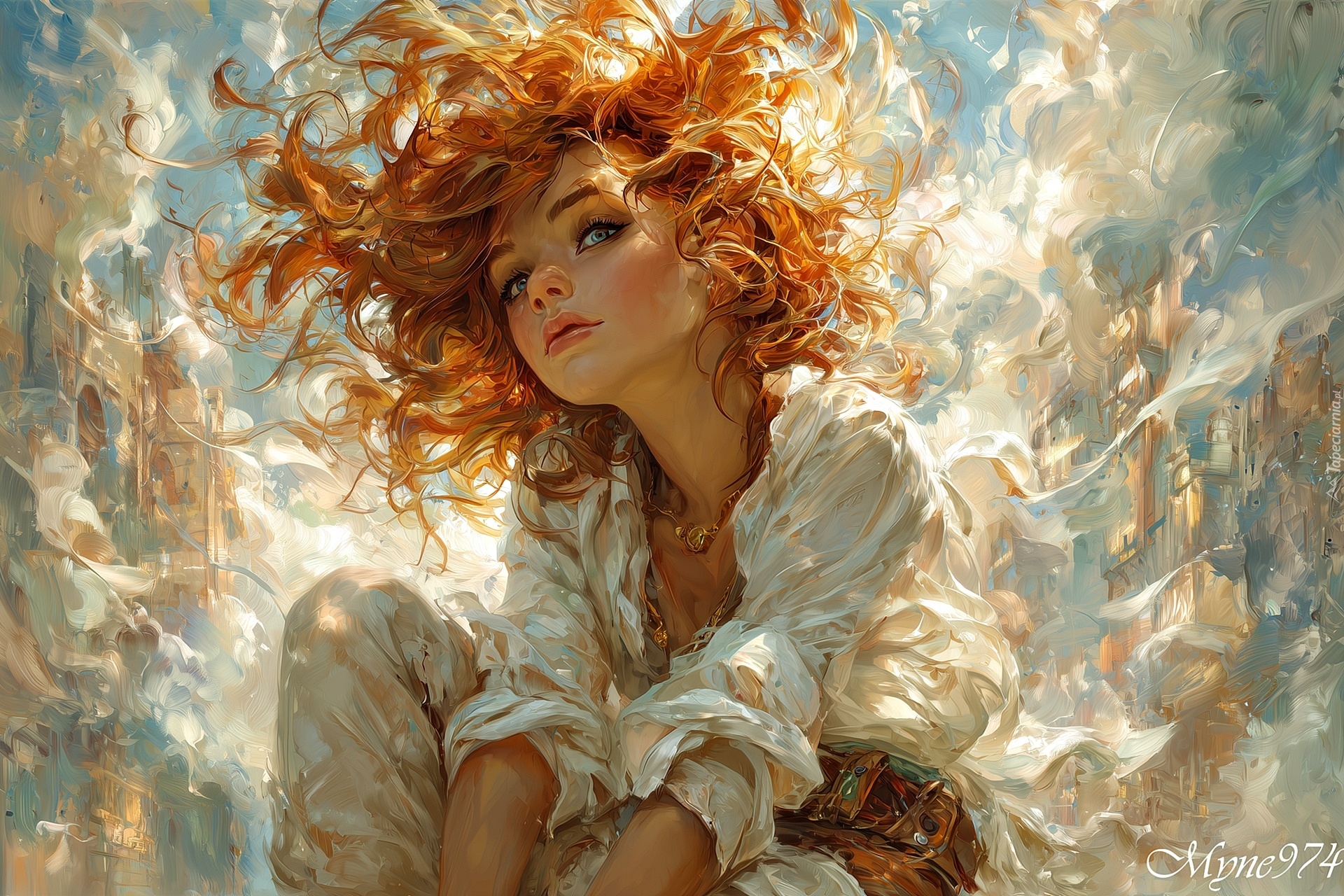 Edytor tapety: Siedząca dziewczyna z rozwianymi rudymi włosami