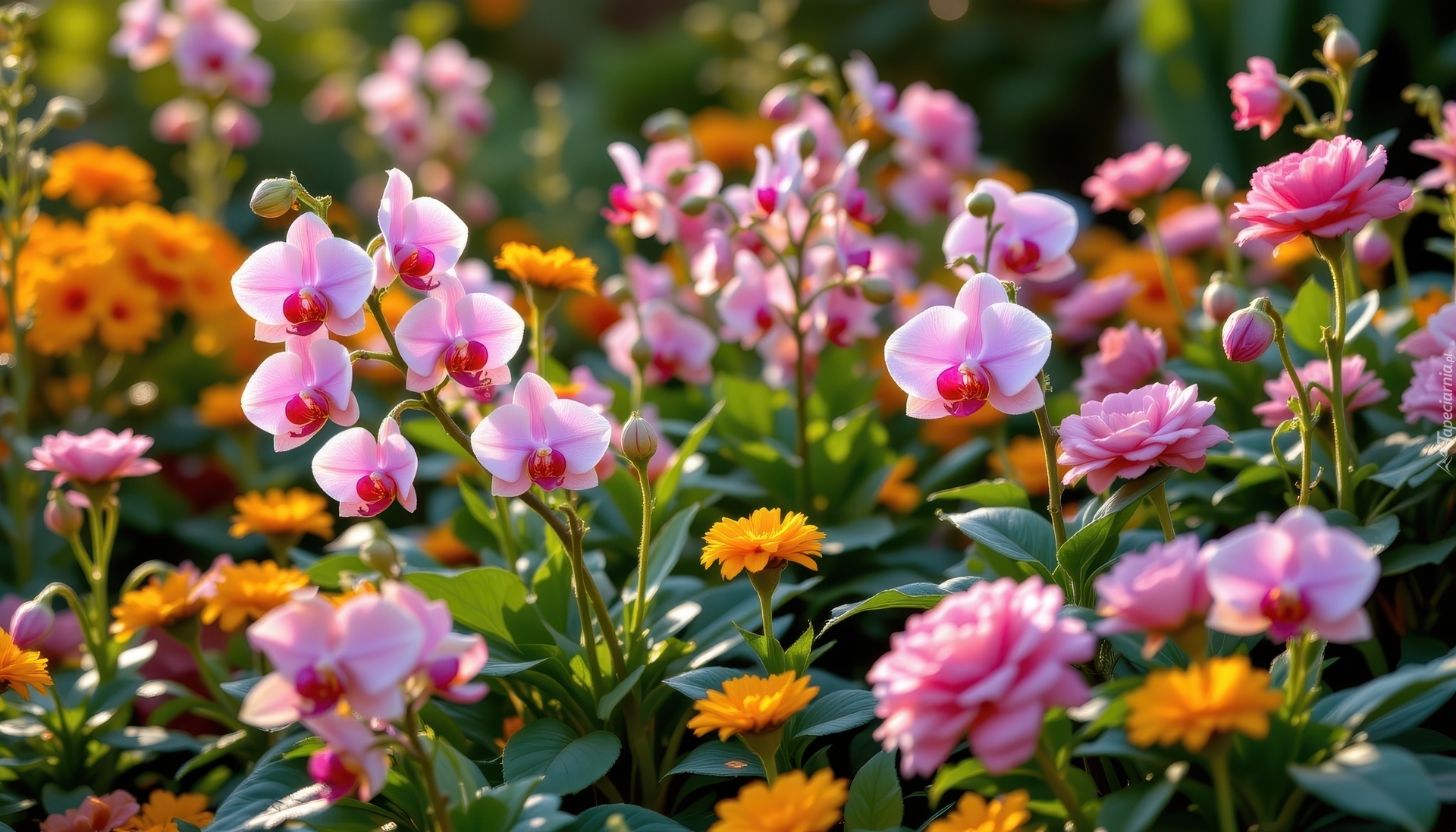 Edytor tapety: Rozświetlone różowe storczyki i róże w ogrodzie
