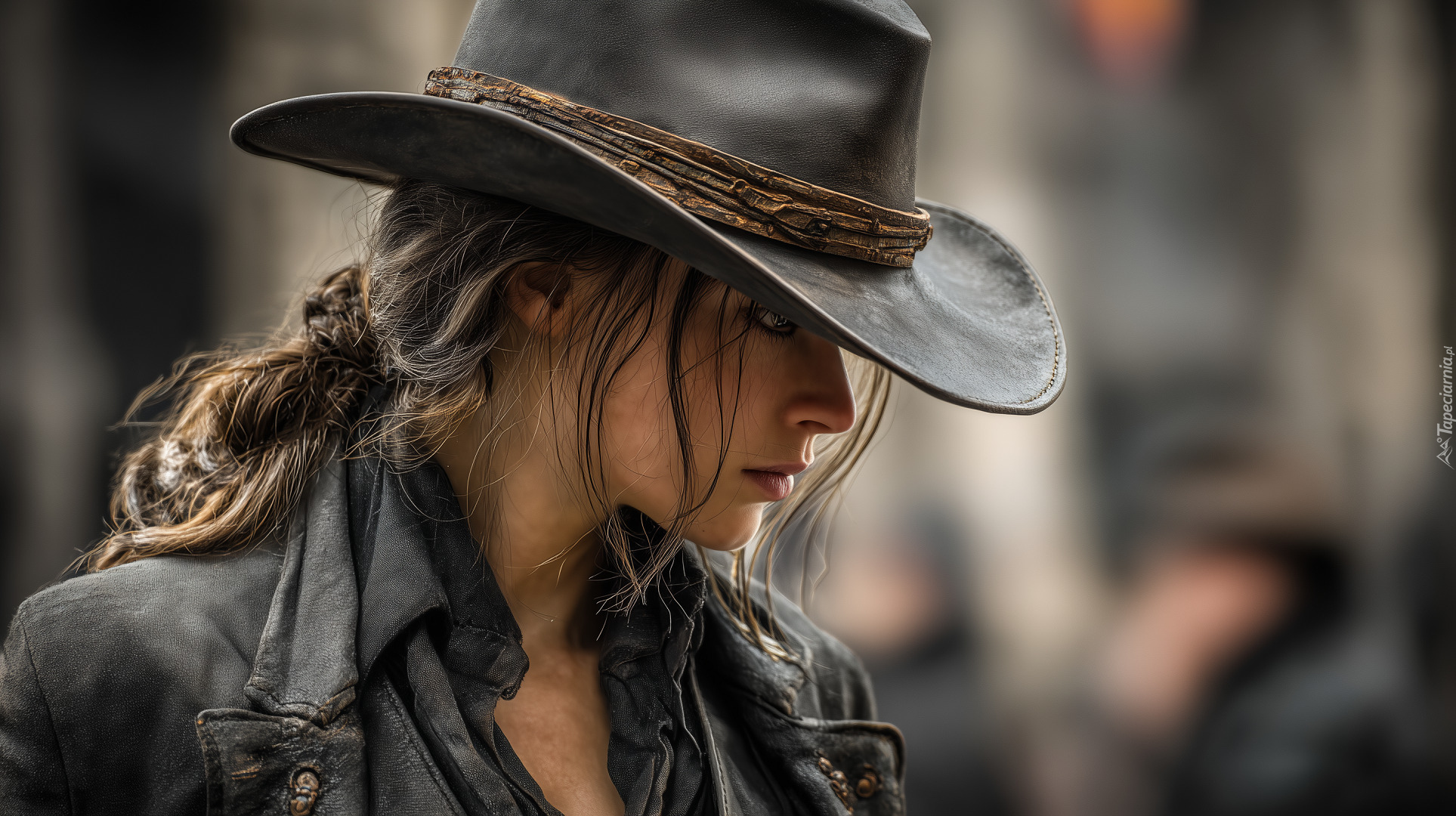 Edytor tapety: Długowłosa kobieta w kapeluszu i kurtce
