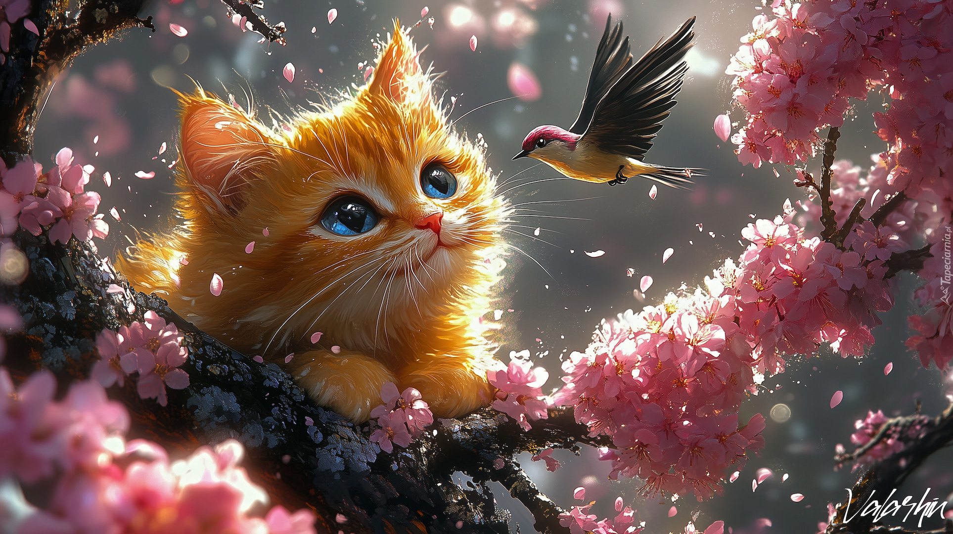 Edytor tapety: Ptak i rudy niebieskooki kot na ukwieconej gałęzi