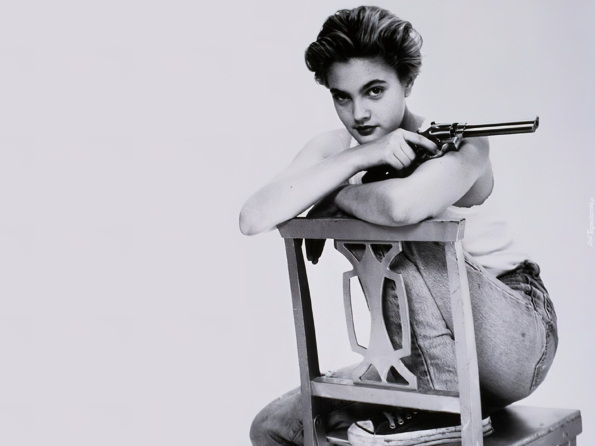 Edytor tapety: Drew Barrymore, pistolet, krzesło, trampki