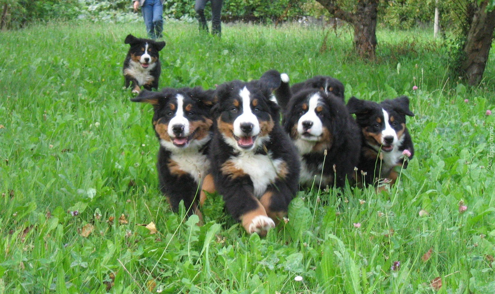 Edytor tapety: Berneńskie psy pasterskie, zielona, trawa