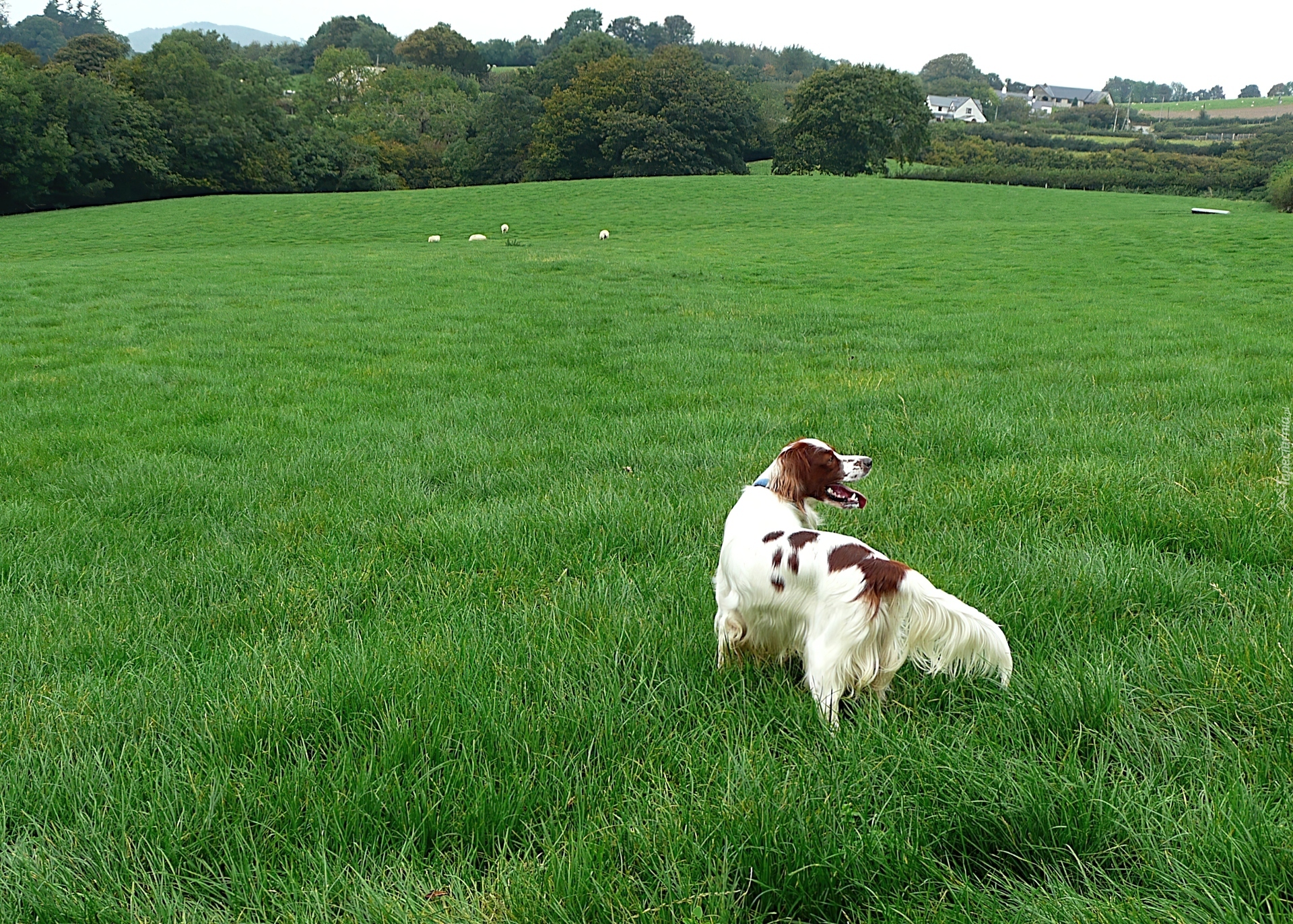 Edytor tapety: Seter irlandzki czerwono-biały, łąka
