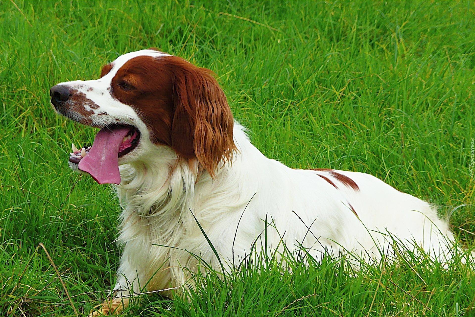 Edytor tapety: Seter irlandzki czerwono-biały, język, młoda, trawa