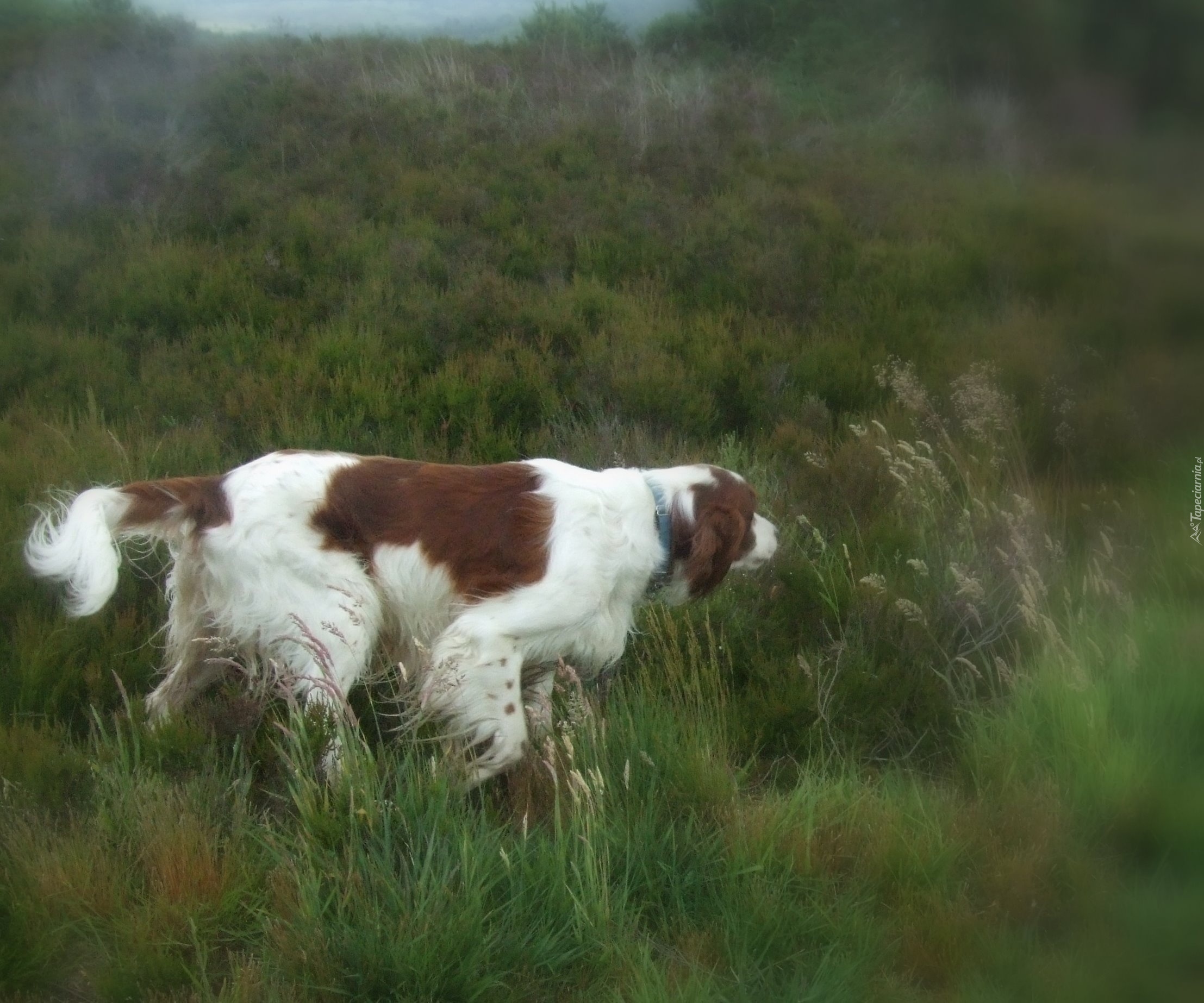 Edytor tapety: Seter irlandzki czerwono-biały, łąka