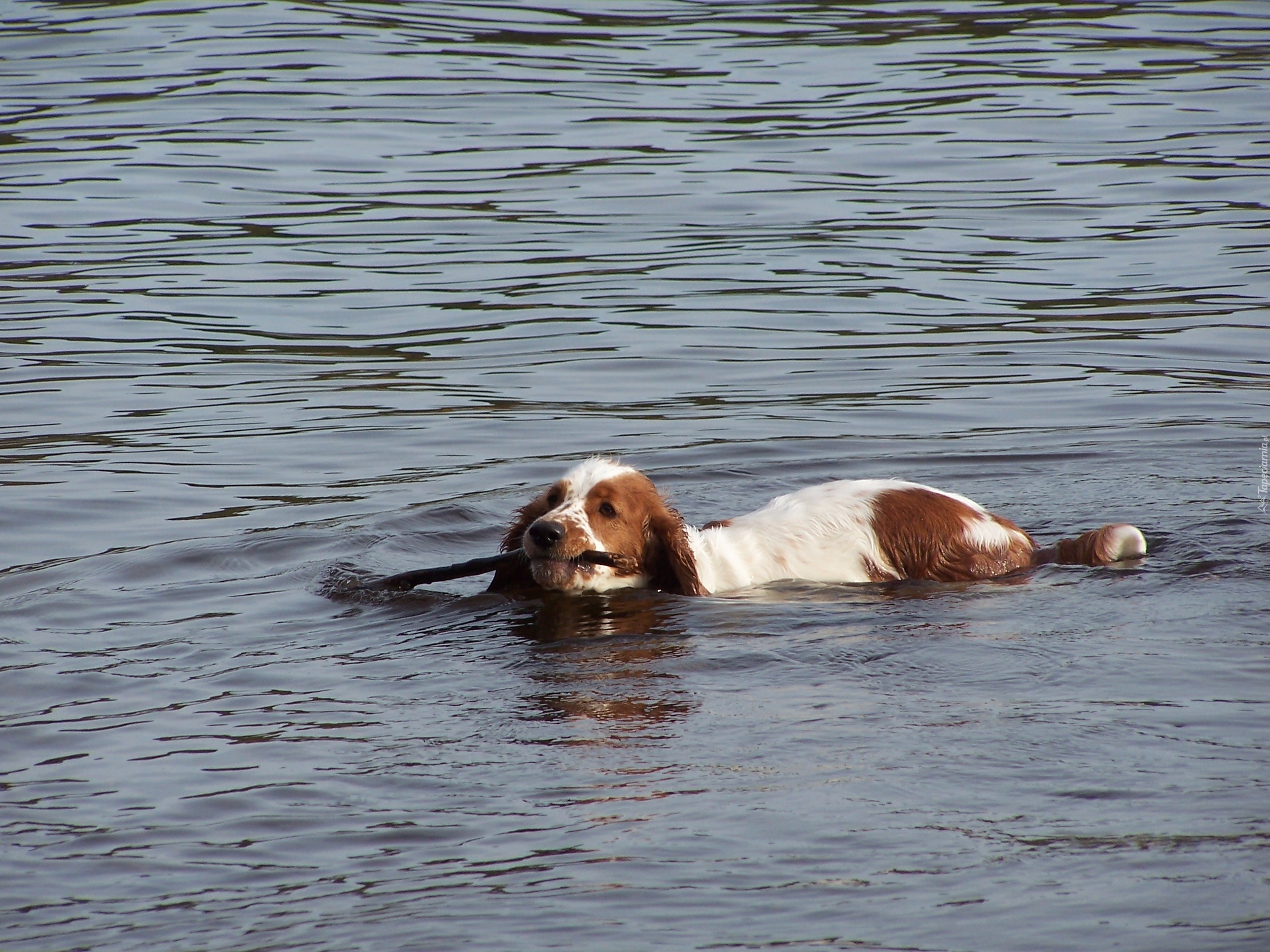 Edytor tapety: płynący, Springer spaniel walijski, kij, woda