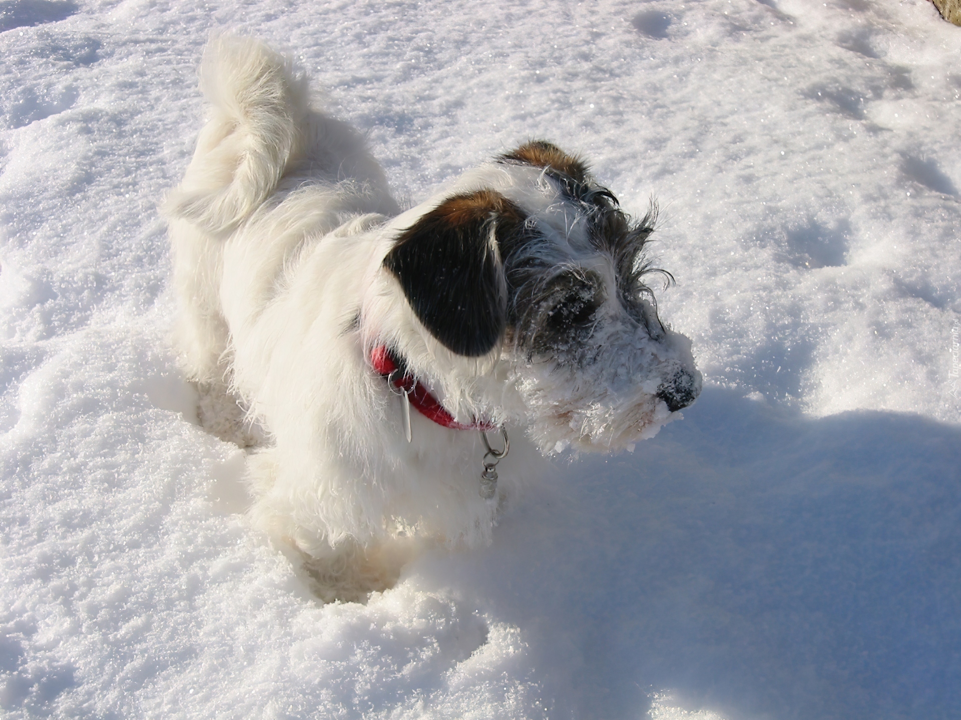 Edytor tapety: Sealyham Terrier, śnieg, czerwona, obroża