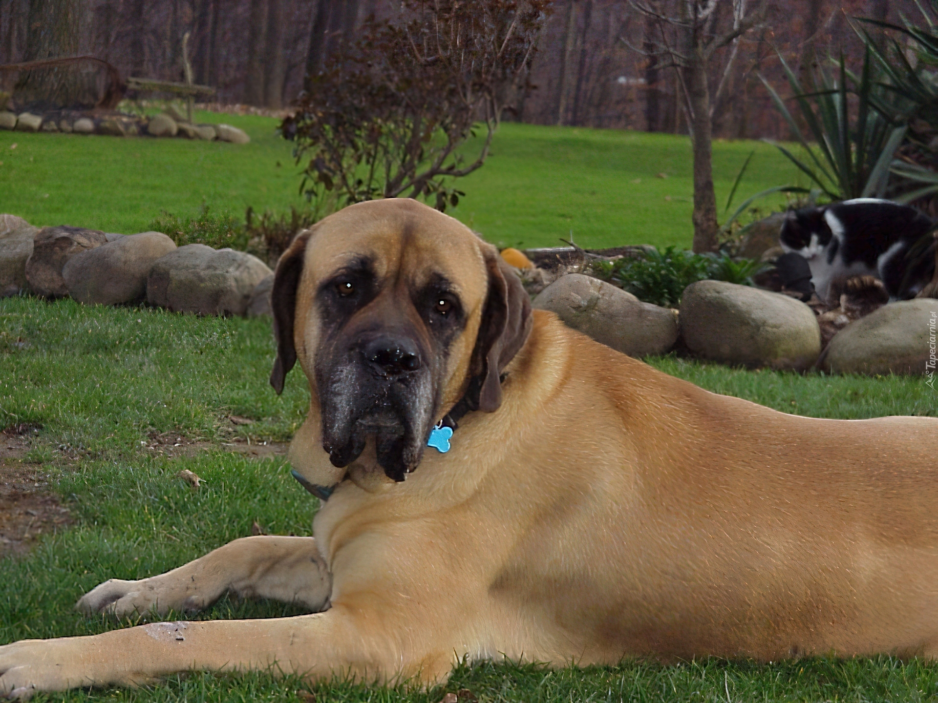 Edytor tapety: Mastif angielski, Mastiff, ogród, kot