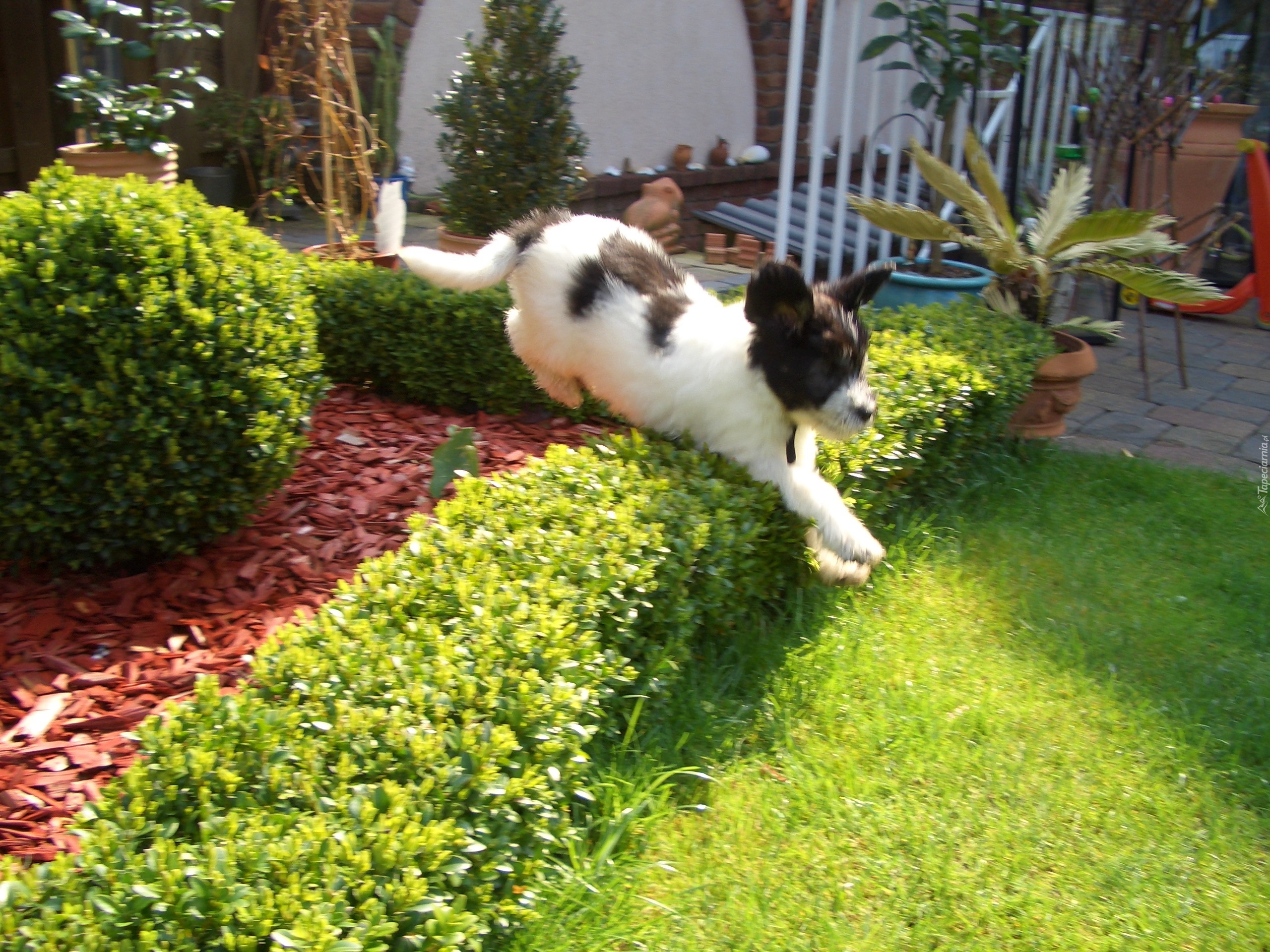 Edytor tapety: Skaczący, Polski owczarek nizinny, żywopłot