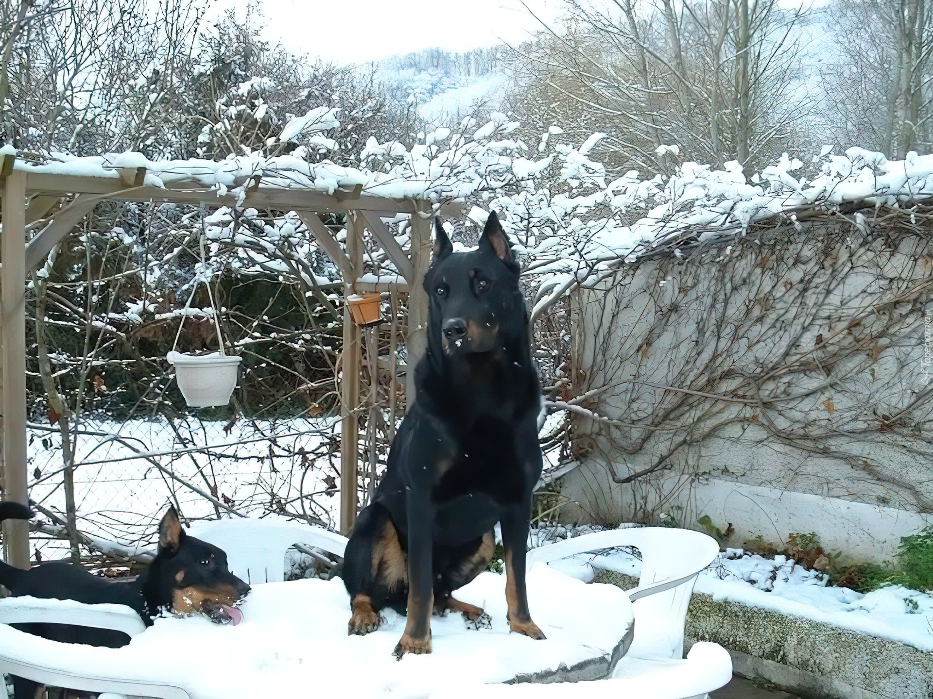 Edytor tapety: Owczarek francuski Beauceron, stół, krzesła, śnieg