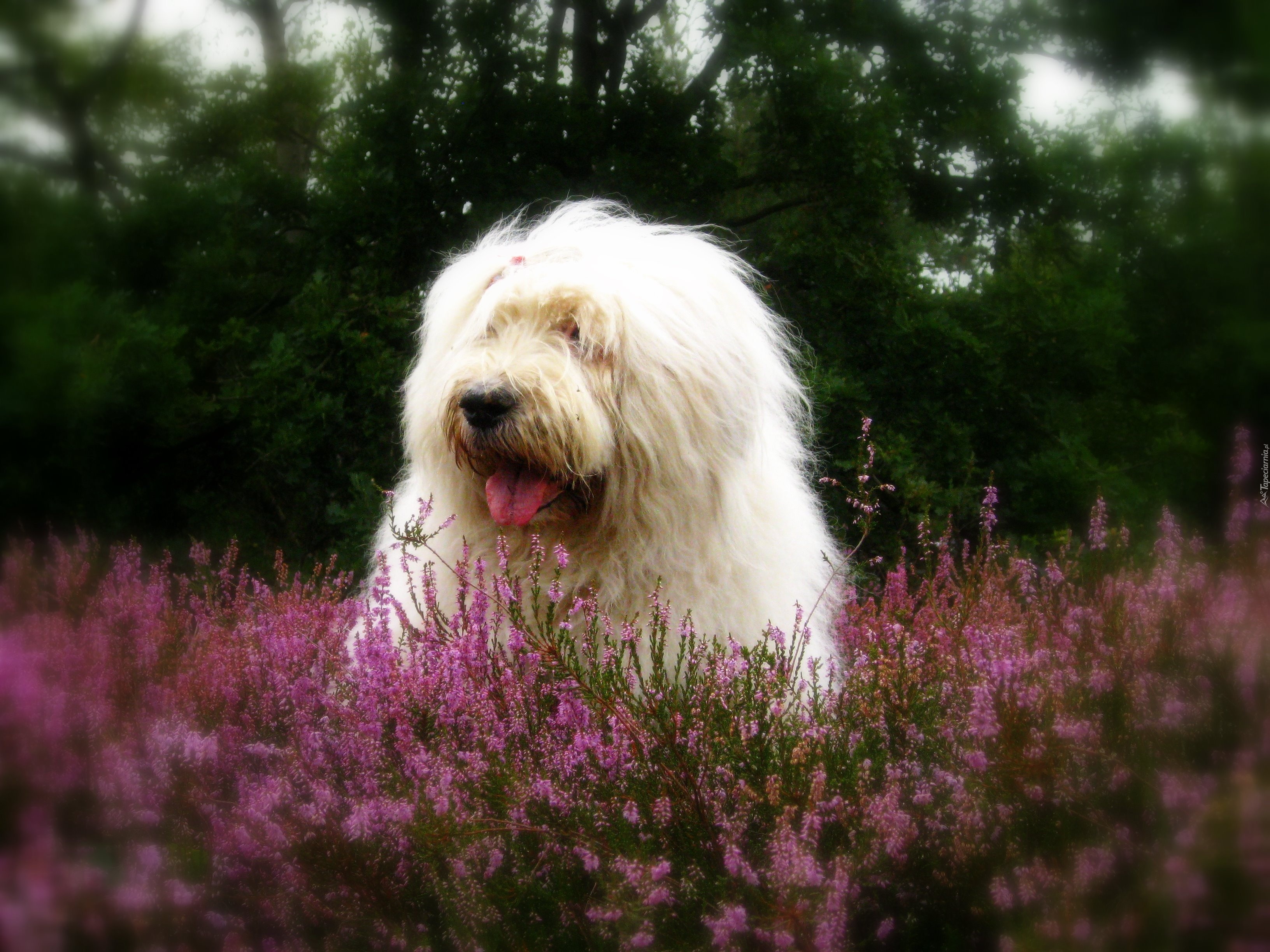 Edytor tapety: Głowa, Owczarek staroangielski Bobtail, wrzosy