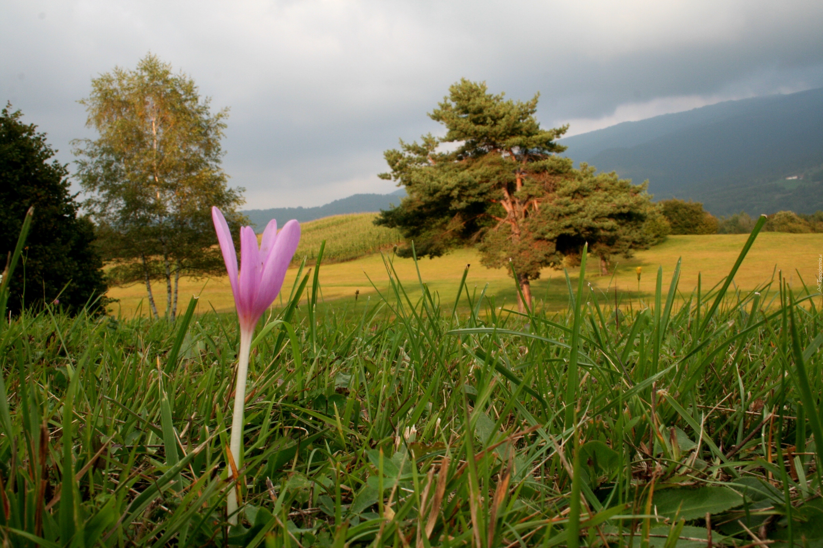 Edytor tapety: Zimowit, Zielona, Trawa, Drzewa, Niebo