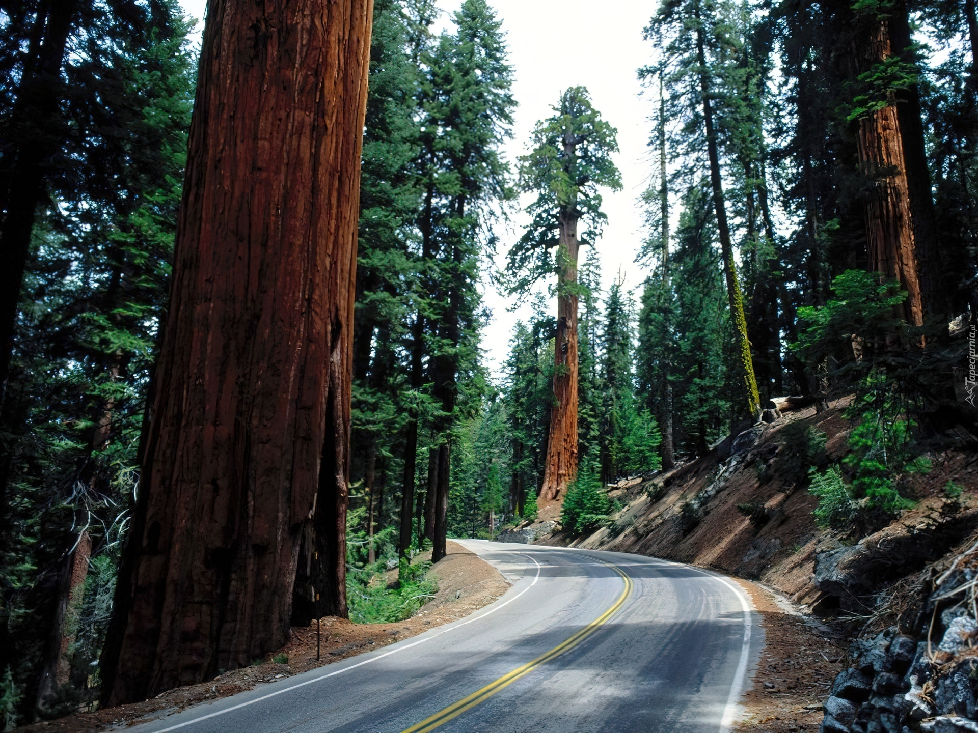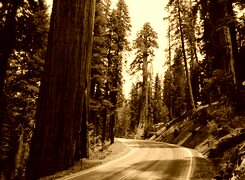 Edytor tapety: Stany Zjednoczone, Kalifornia, Park Narodowy Sekwoi, Droga, Zakręt, Drzewa, Sekwoje