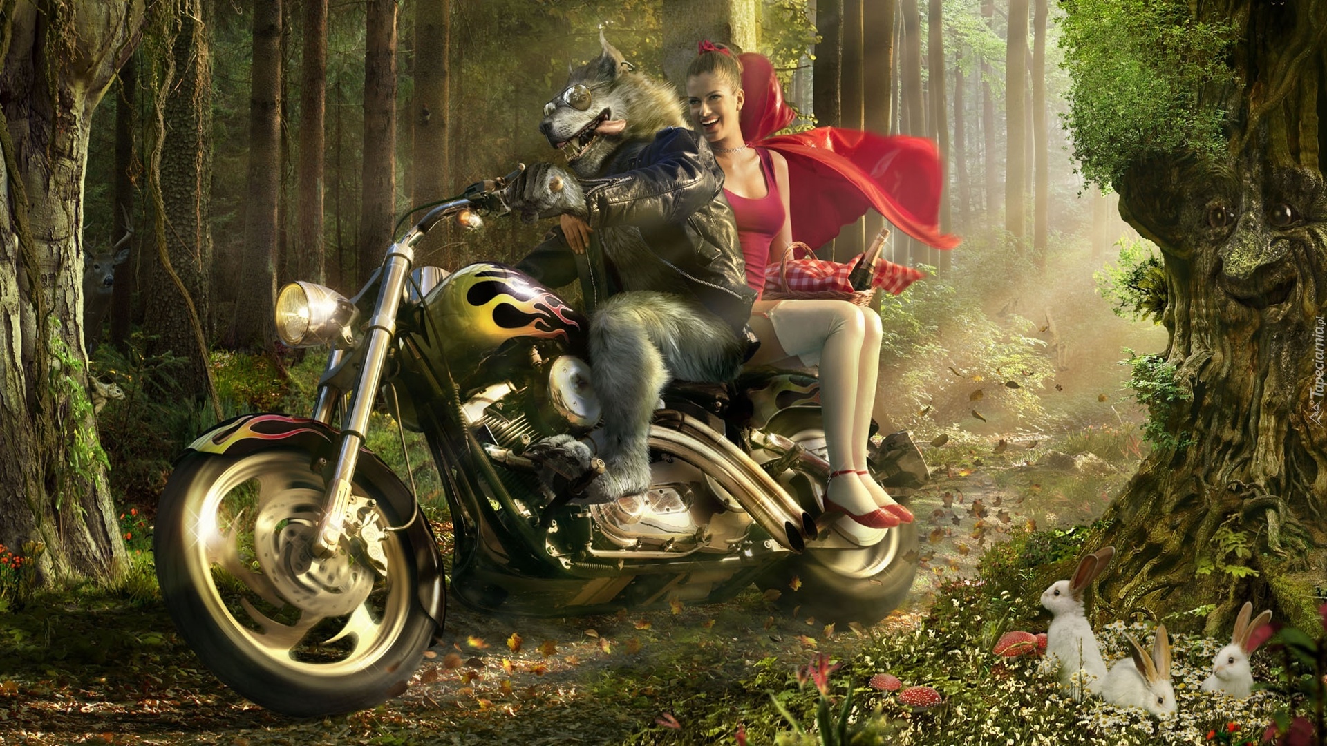 Edytor tapety: Motor,wilk,czerwony,kapturek,las