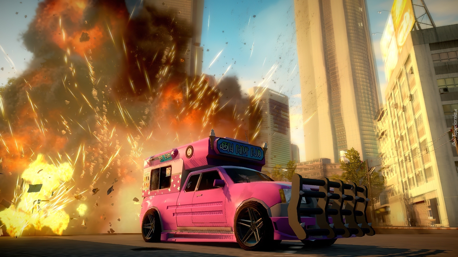 Edytor tapety: Just Cause, Miasto, Różowy, Samochód
