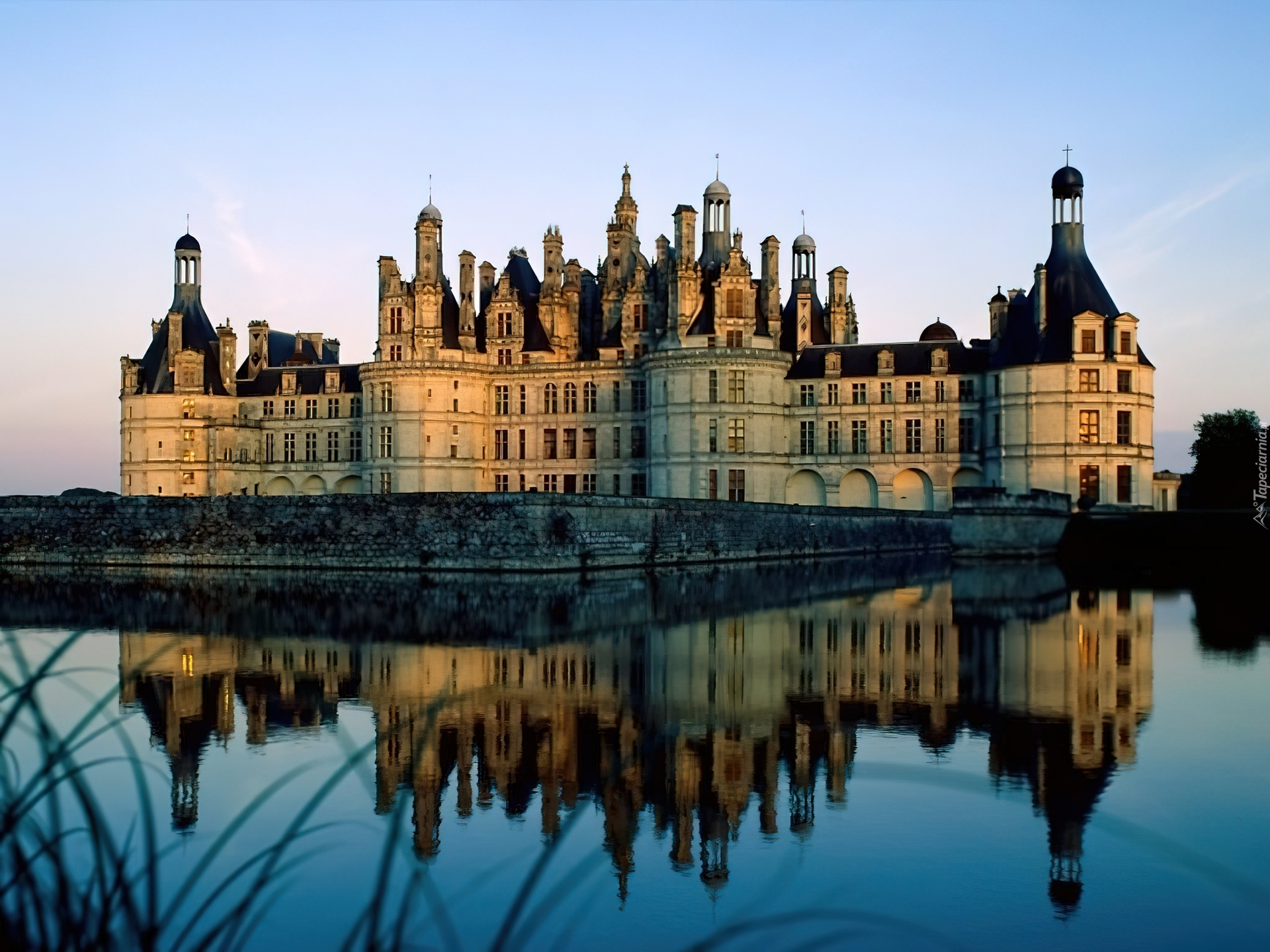 Edytor tapety: Francja, Chambord, Odbicie, Woda, Zamek Chateau de Chambord, Rzeka Cosson