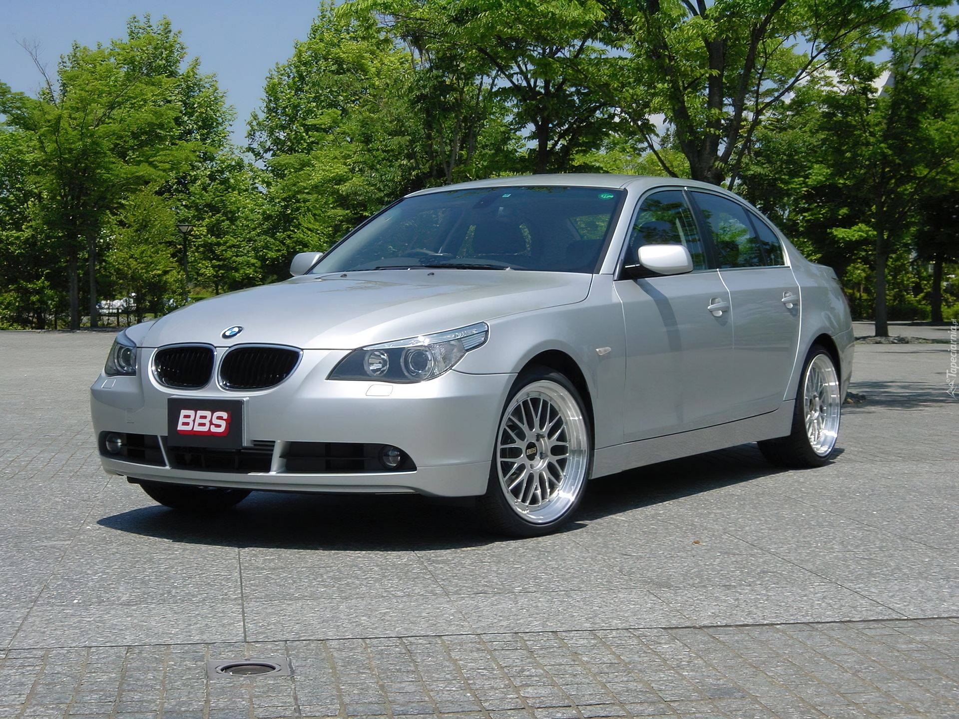 Edytor tapety: BMW 5, Srebrny, E60, Plac, Drzewa