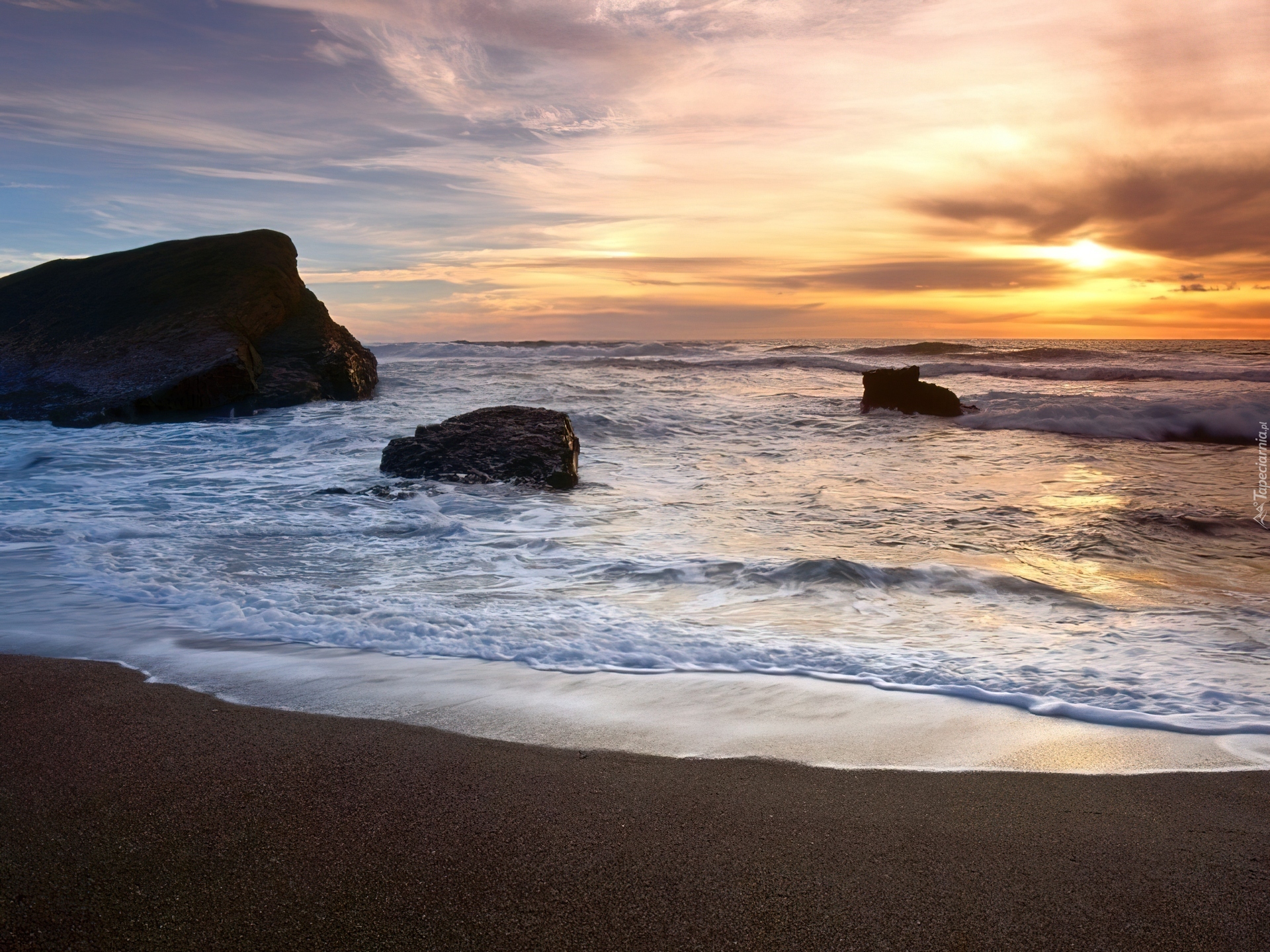 Edytor tapety: Plaża, Zachód Słońca, Fale, Skały
