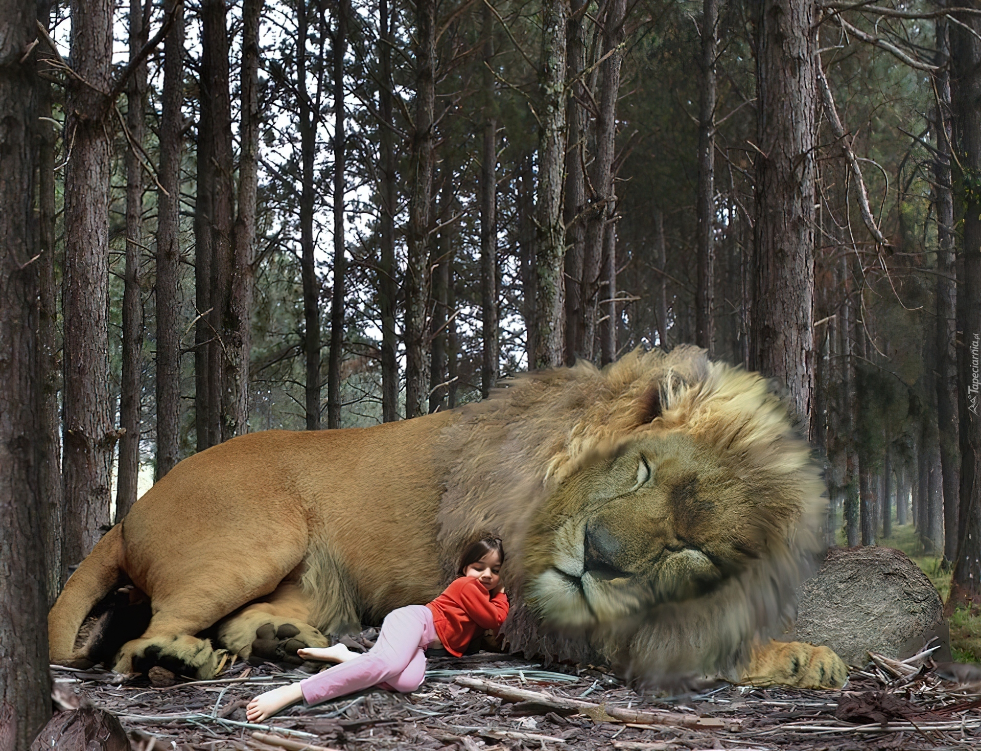 Edytor tapety: Śpiący, Lew, Dziewczynka