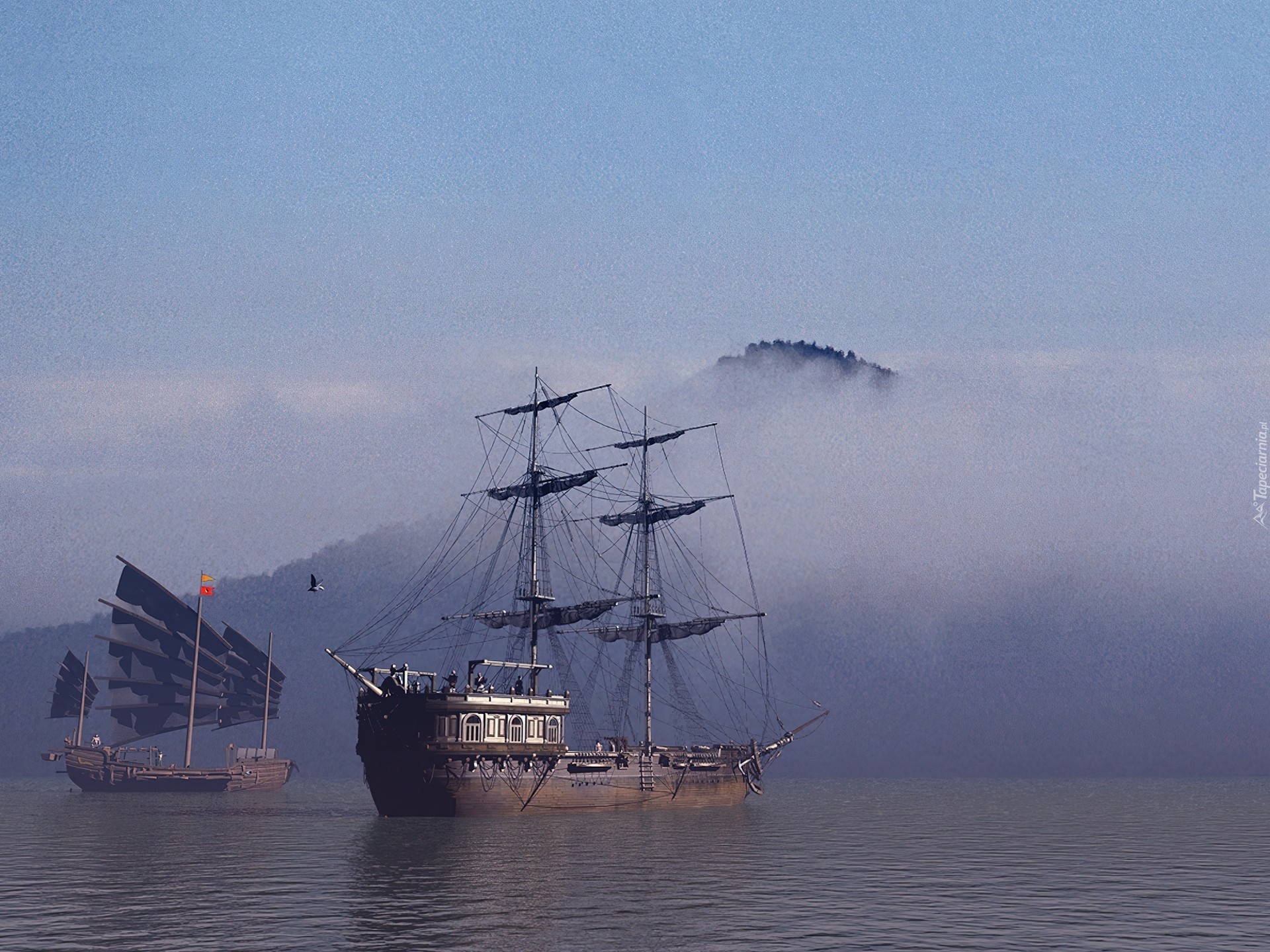 Edytor tapety: Żaglowiec, Morze, Mgła, Wyspa