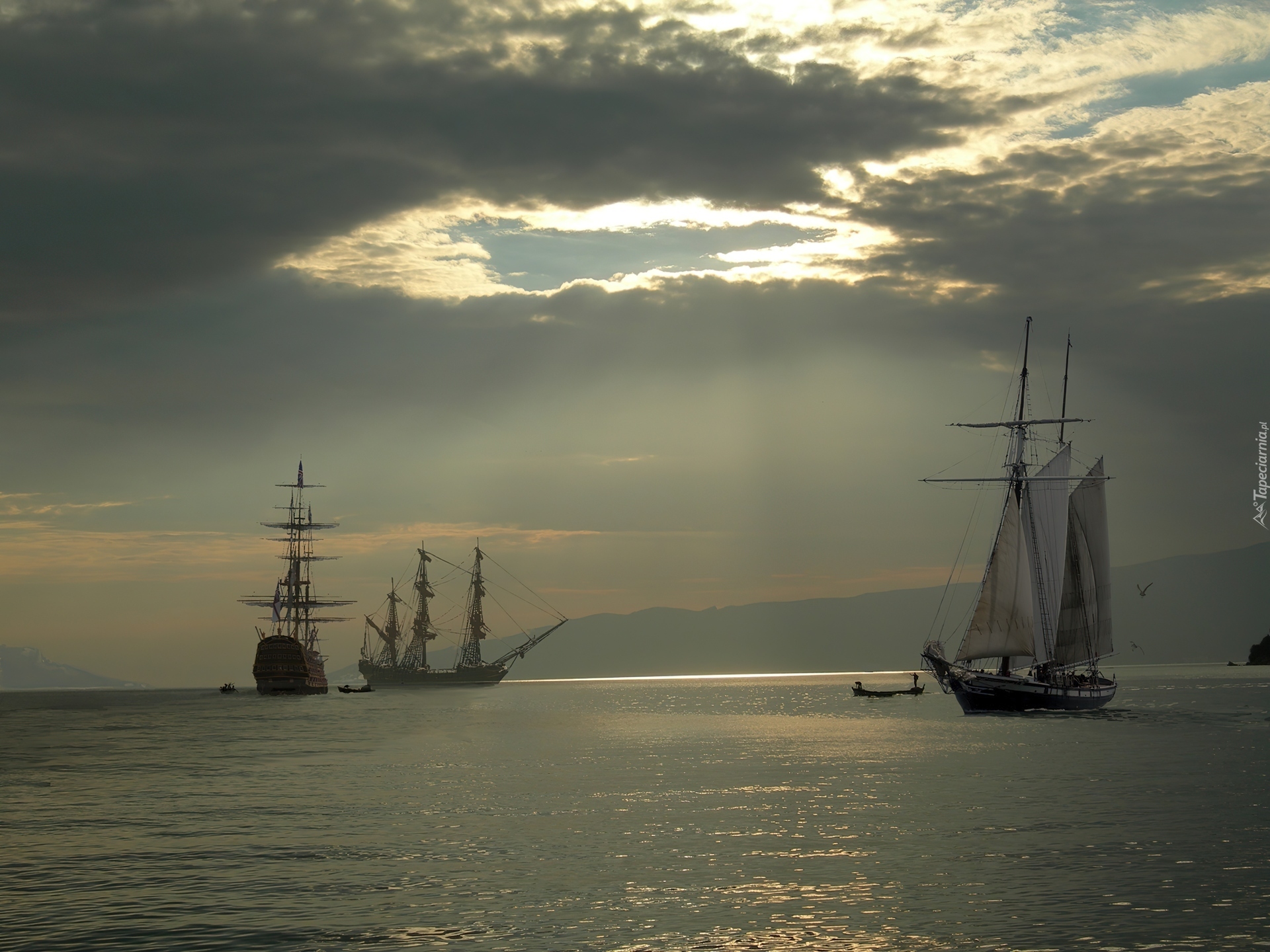 Edytor tapety: Szalupy, Żaglowce, Słońce