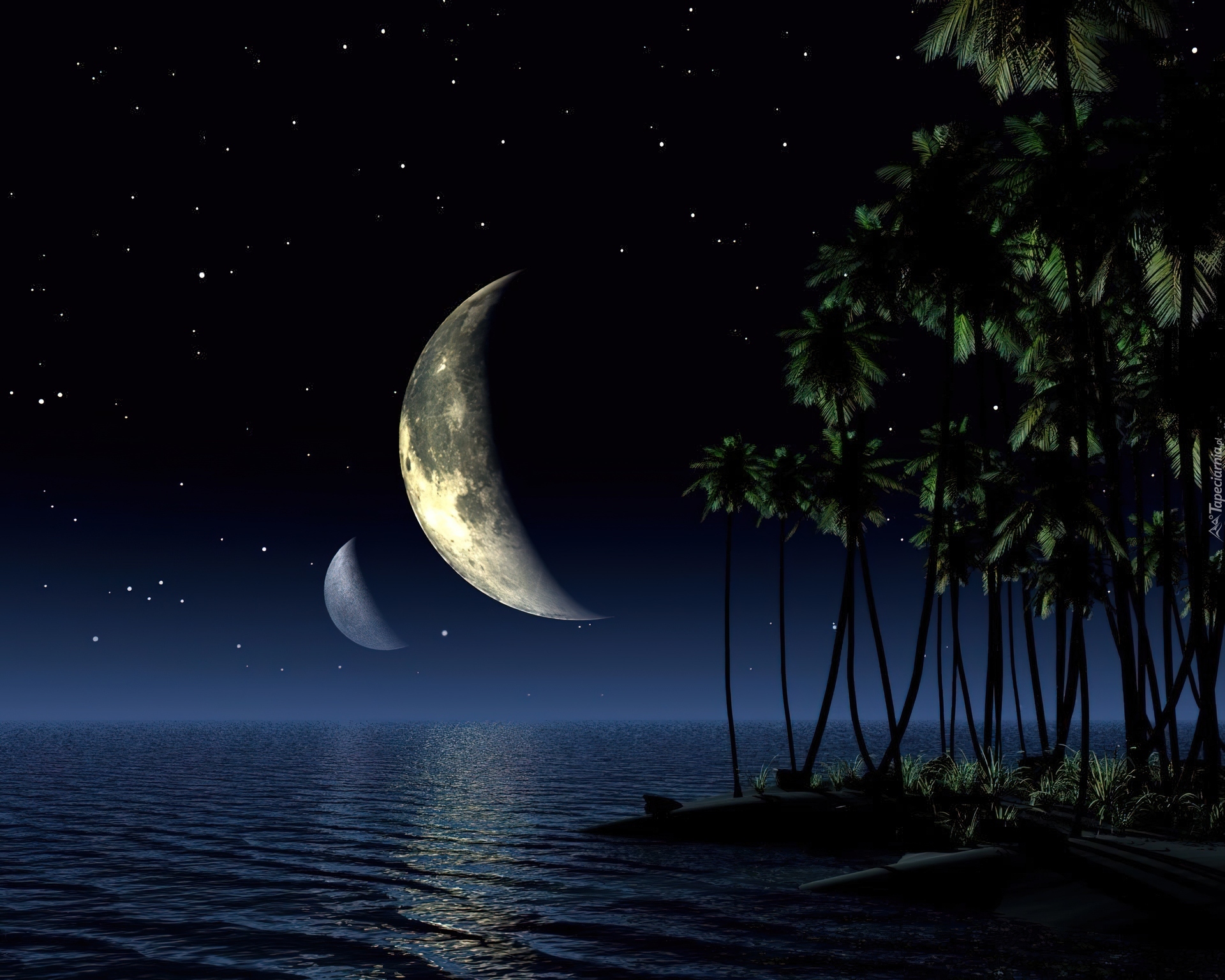 Edytor tapety: Dwa, Księżyce, Gwiazdy, Palmy