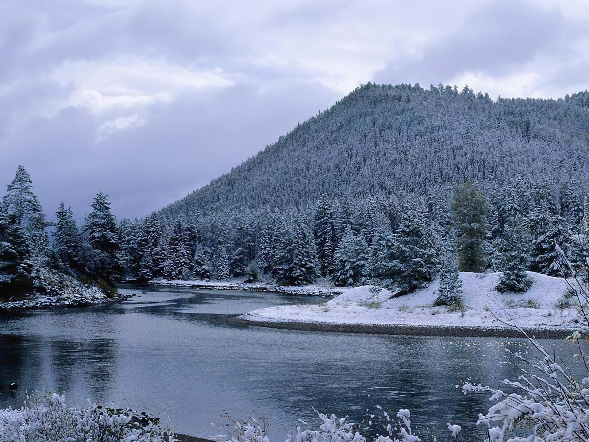 Edytor tapety: Zbocze, Góry, Świerki, Rzeka