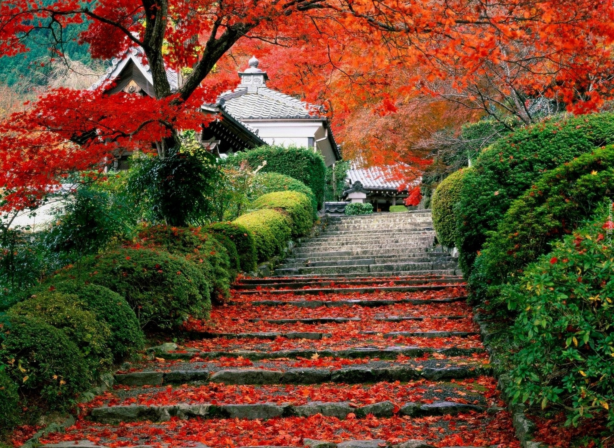 Edytor tapety: Dom, Japonia, Drzewo, Schody, Liście