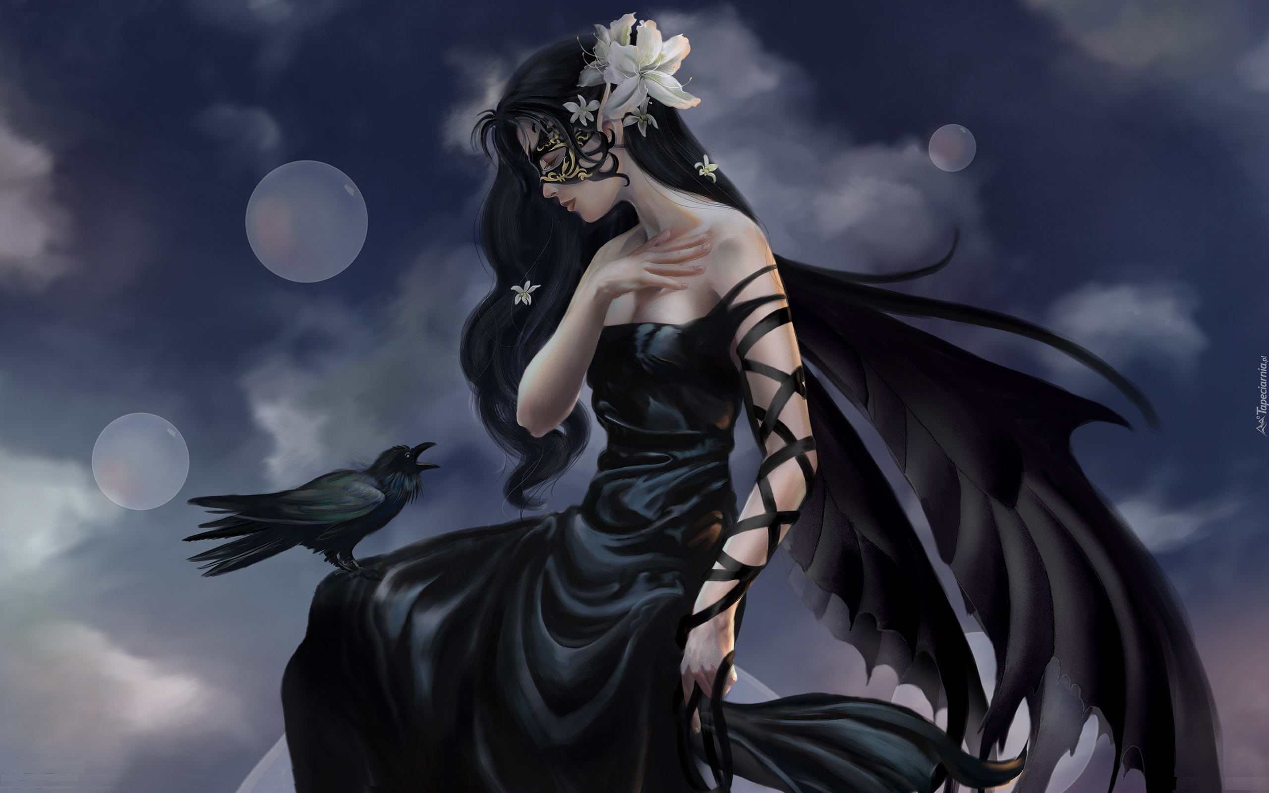 Edytor tapety: Czarna, Kobieta, Skrzydła, Kruk
