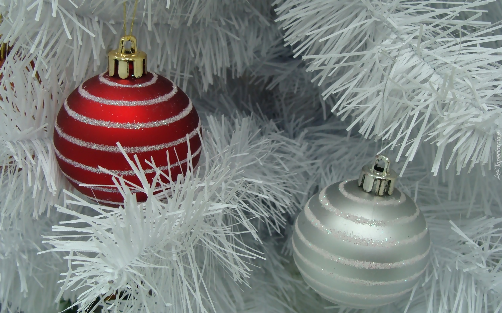 Edytor tapety: Białe, Gałązki, Choinki, Bombki